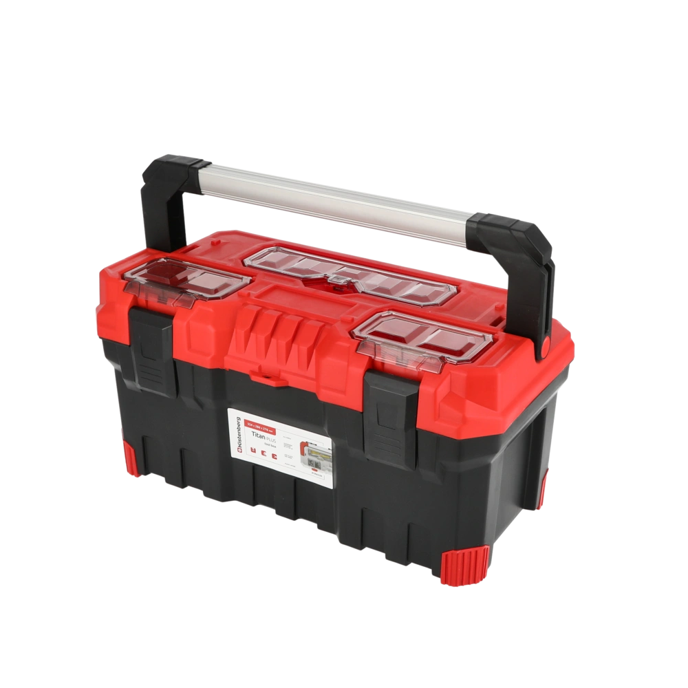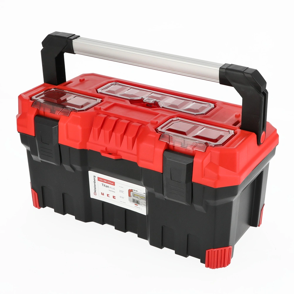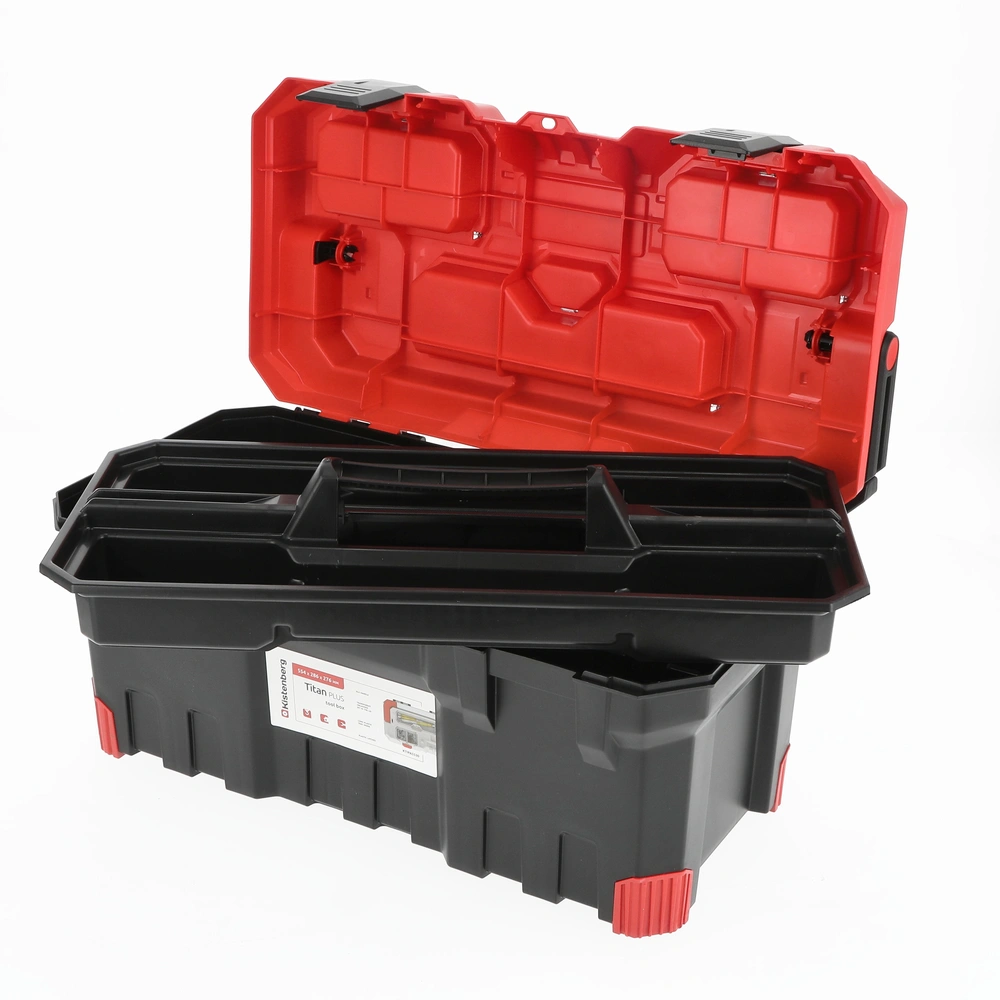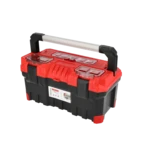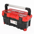 Robuste boîte à outils équipée de fermetures en plastique solide et d'une poignée de transport verrouillable. Les bords sont recouverts d'un caoutchouc de protection. Un plateau porte-outils...