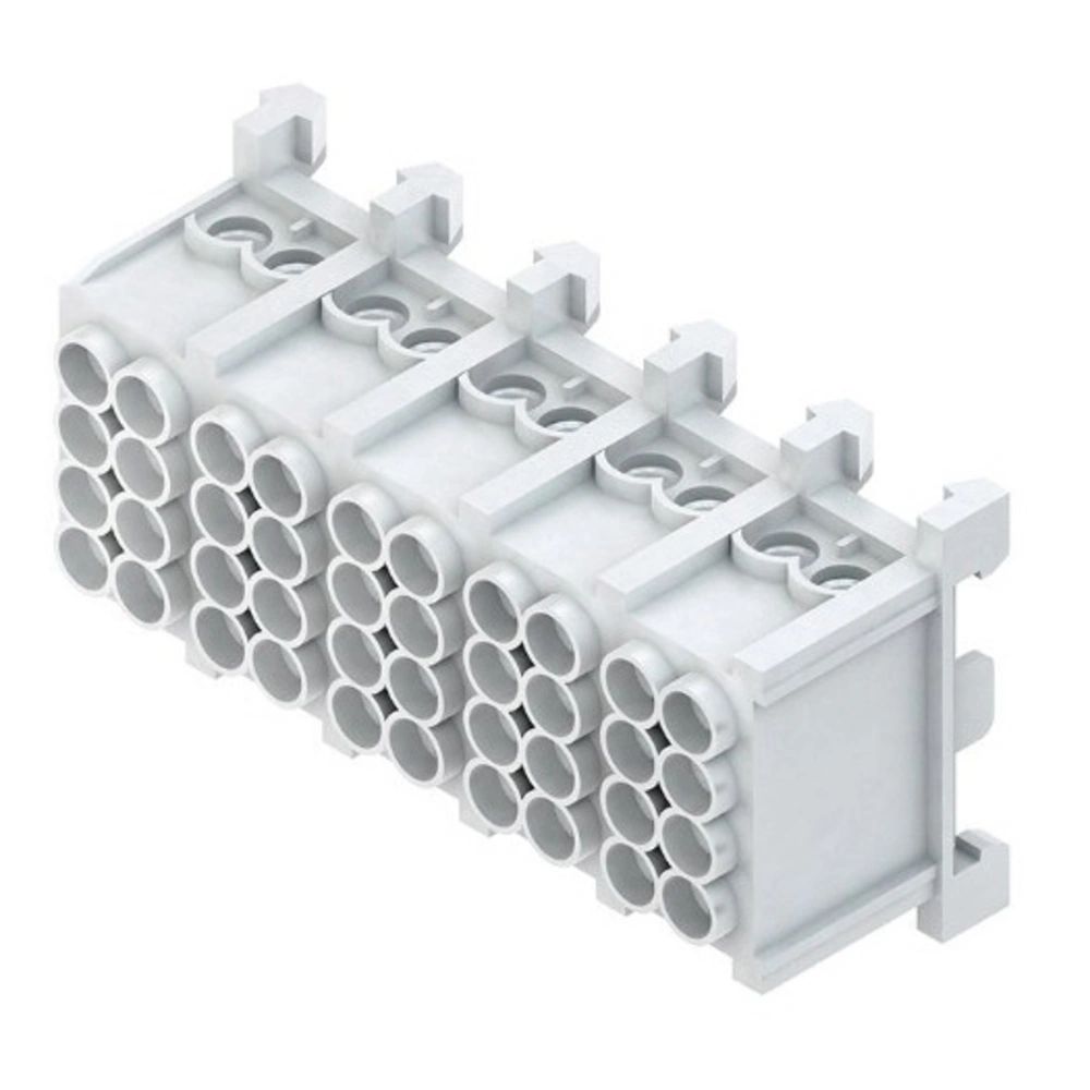 Borne de dérivation principale avec fixation par encliquetage pour un montage vertical ou horizontal sur des rails porteurs de 35 mm. La borne est protégée des doigts de tous les côtés