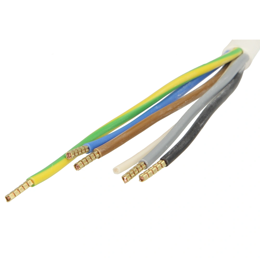 Câble de raccordement de cuisinière avec embouts et un conducteur de protection vert-jaune. Un côté est composé d'embouts dénudés de 50 mm, l'autre d'embouts dénudés de 110 mm.