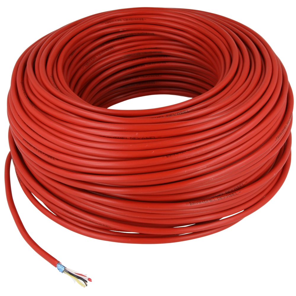 Câble pour systèmes d'alarme incendie. Convient pour une installation fixe dans des pièces sèches et humides. Les conducteurs en cuivre sont câblés par paires en couches. Le blindage est assuré par une feuille d'aluminium laminée de plastique. La veste en PVC rouge est imprimée avec BRANDMELDEKABEL.