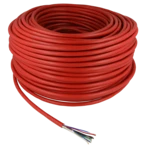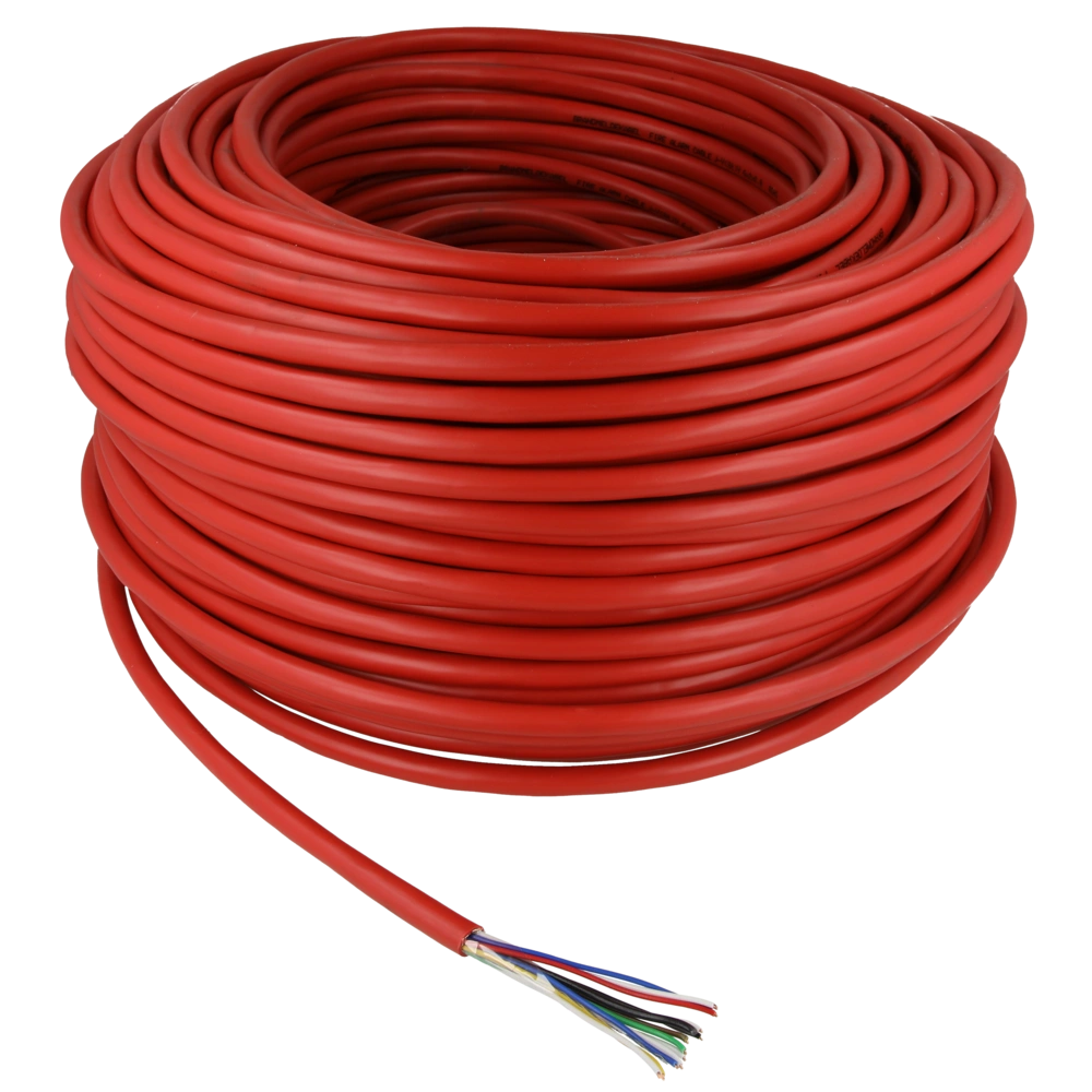 Câble pour systèmes d'alarme incendie. Convient pour une installation fixe dans des pièces sèches et humides. Les conducteurs en cuivre sont câblés par paires en couches. Le blindage est assuré par une feuille d'aluminium laminée de plastique. La veste en PVC rouge est imprimée avec BRANDMELDEKABEL.