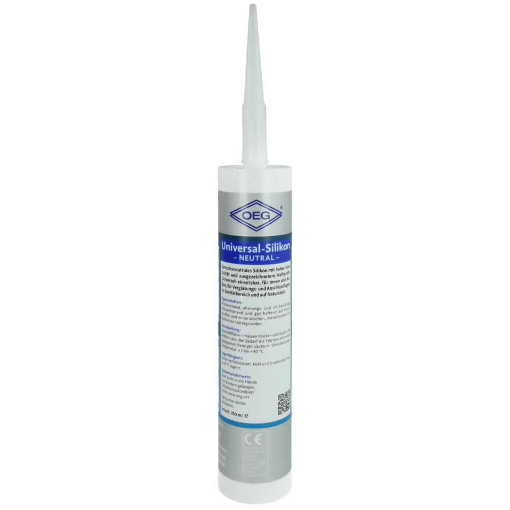 Le silicone universel OEG inodore adhère parfaitement aux plastiques et aux surfaces minérales, métalliques et peintes. Il est antifongique, a une grande élasticité et résiste au vieillissement et aux rayons UV. Le silicone universel OEG est idéal pour l'intérieur et l'extérieur, pour les vitrages et les joints de raccordement, dans les sanitaires et sur les pierres naturelles.