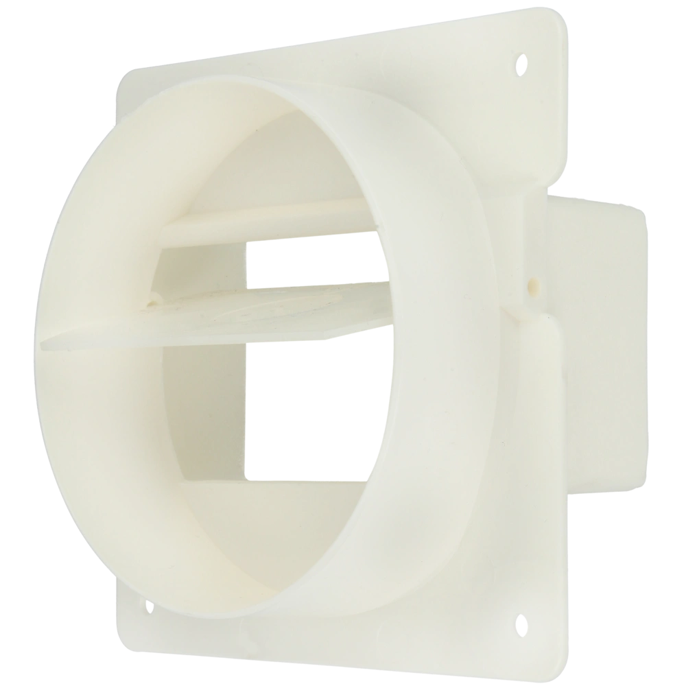 Clapet anti-refoulement en polystyrène avec joint en caoutchouc mousse pour un montage horizontal dans les gaines de ventilation. Le clapet sert de transition entre le canal plat et le tuyau de ventilation rond.