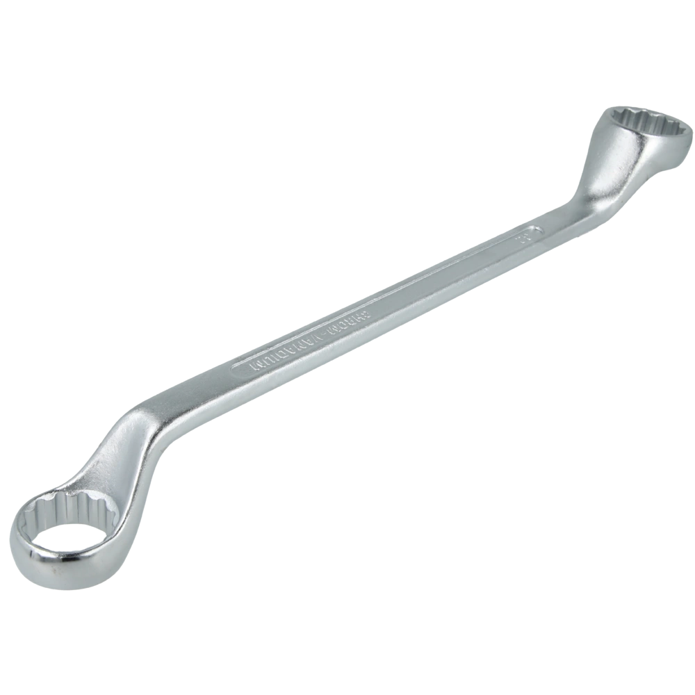 La clé mixte double coudée est en acier chrome-vanadium chromé et satiné. Les deux anneaux coudés sont à paroi mince et polis.