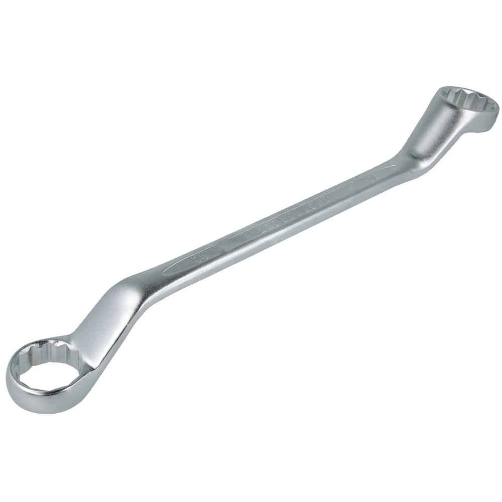 La clé mixte double coudée est en acier chrome-vanadium chromé et satiné. Les deux anneaux coudés sont à paroi mince et polis.