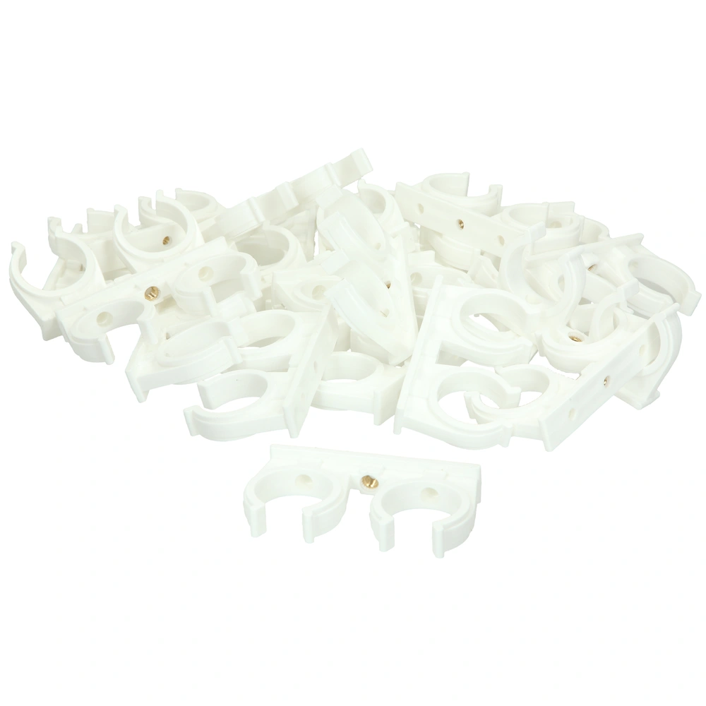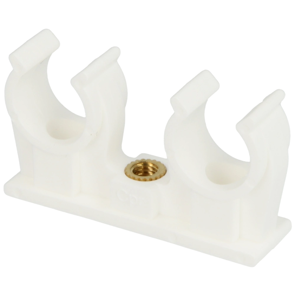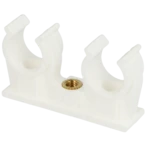 Clips pour tubes en PP pour la pose et la fixation de tuyaux. Ils sont équipés d'une douille filetée en laiton et sont résistants aux alcalis et au cuivre