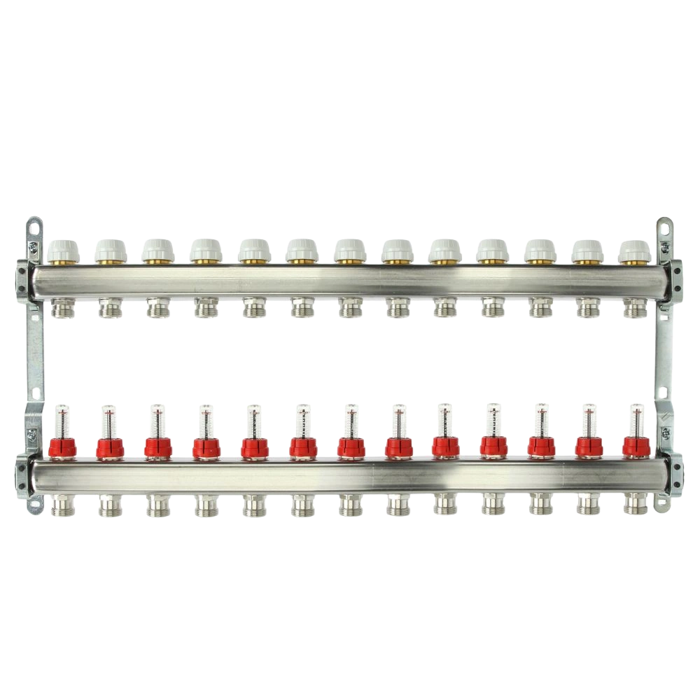 Toutes les informations sur le produitCollecteur plancher chauffant avec débitmètres dans le départ avec vannes de régulation et d'arrêt pour le raccordement de servomoteurs à régulation électrique dans le retour. Le collecteur est livré prémonté, mais les barres de distribution peuvent être échangées sans problème.