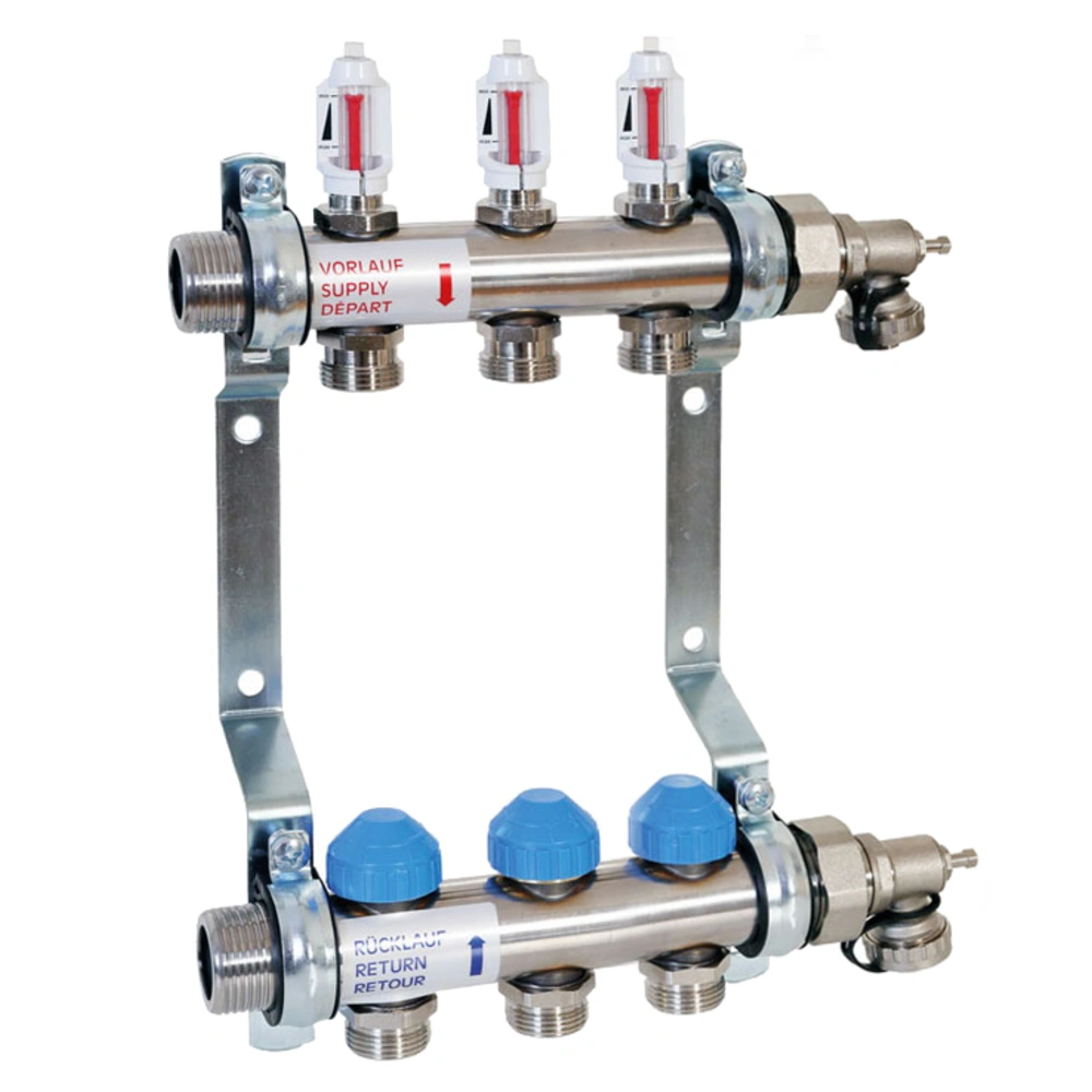 Collecteur de circuit de chauffage au sol avec inserts Dynacon Eclipse pour un équilibrage hydraulique fiable, simple et automatique.