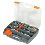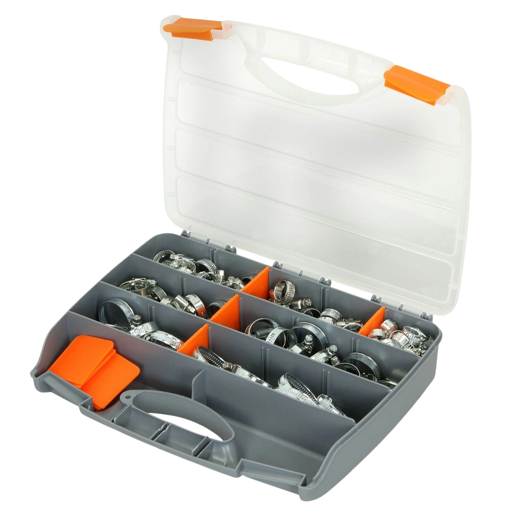Les colliers de serrage galvanisés sont rangés selon la taille dans une mallette robuste résistant aux chocs. Vous avez ainsi de suite le bon collier à portée de main.