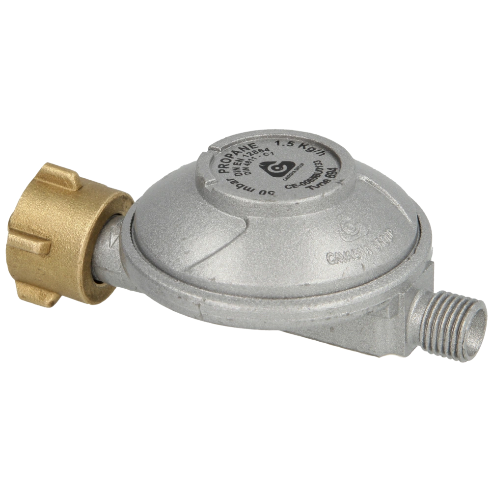 Détendeur basse pression pour le camping et le BBQ pour le raccordement sur les petites bouteilles de gaz liquide de 5 à 14 kg. Il est autorisé selon les épreuves du type de construction CE.