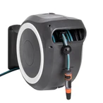 Dévidoir pour montage mural. Le tuyau peut être facilement retiré sans trop de force et verrouillé en place à de courts intervalles. Le guide de tuyau empêche le tuyau de se plier ou de se nouer pendant la rétraction automatique...