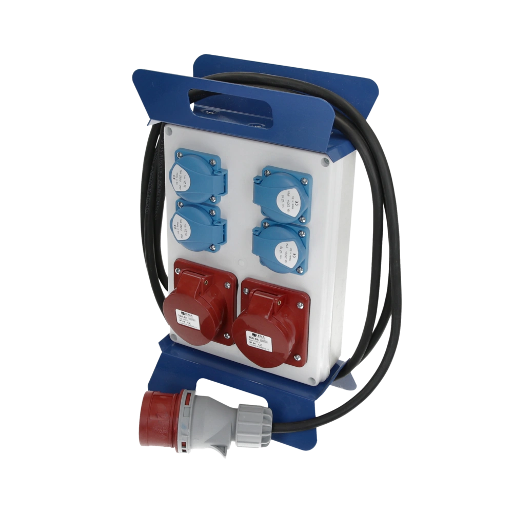 Distributeur de courant portable pour les appareils de 230V et 400V. Le distributeur est raccordé à une prise CEE 400V avec une fiche CEE 400V 16A à 5 broches. Le câble d'alimentation a une longueur de 2,50 m.