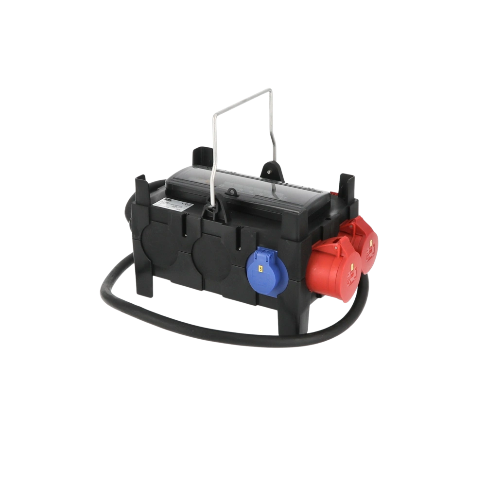 Distributeur compact mobile avec poignée de transport en version robuste, solution idéale pour les chantiers ou les ateliers. Les disjoncteurs pour la protection des prises sont câblés derrière un volet de protection sur des bornes prêtes à être raccordées. Grâce à sa forme compacte, il est peu encombrant et facile à ranger.