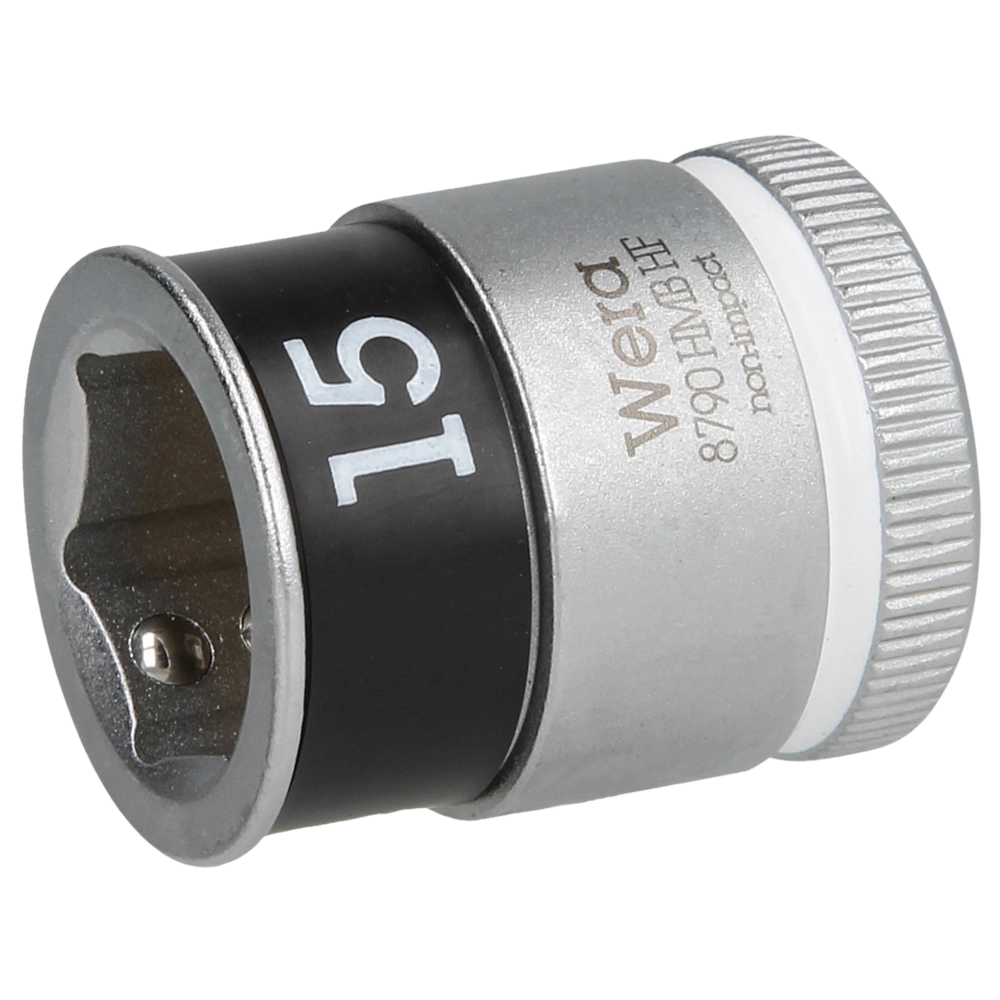 Douille avec fonction de retenue pour une utilisation manuelle ou mécanique. L'insert est doté du code couleur "Take it easy" en fonction des tailles. Il est doté de rainures de retenue des billes et convient aux vis et écrous à six pans creux.