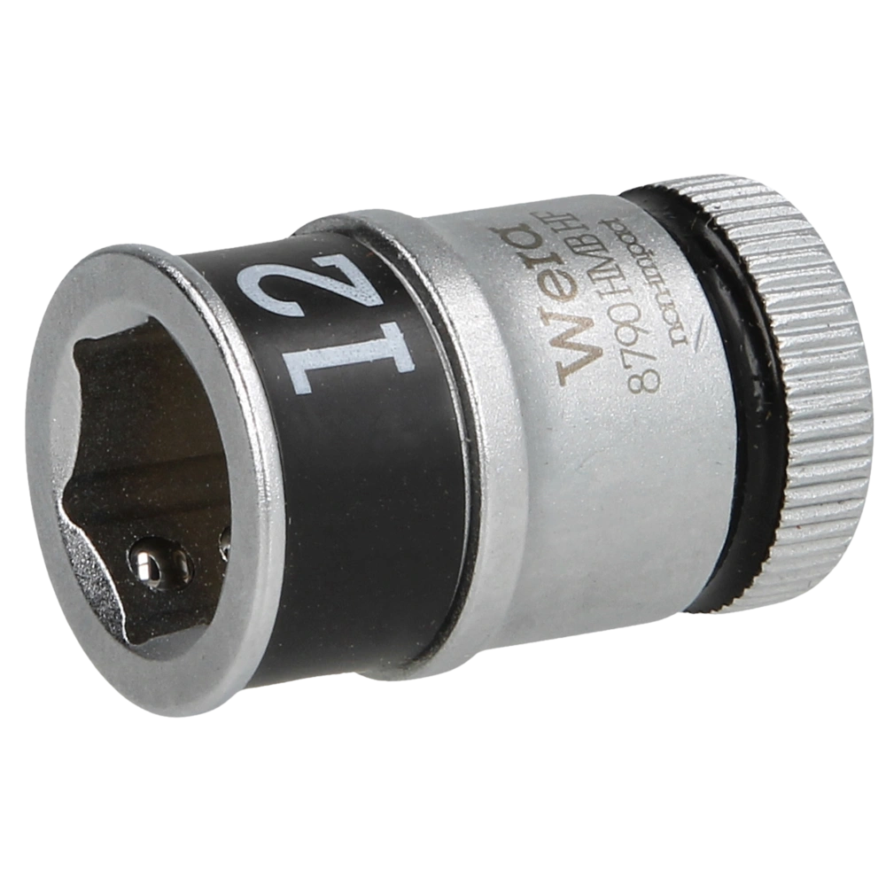Douille avec fonction de retenue pour une utilisation manuelle ou mécanique. L'insert est doté du code couleur "Take it easy" en fonction des tailles. Il est doté de rainures de retenue des billes et convient aux vis et écrous à six pans creux.