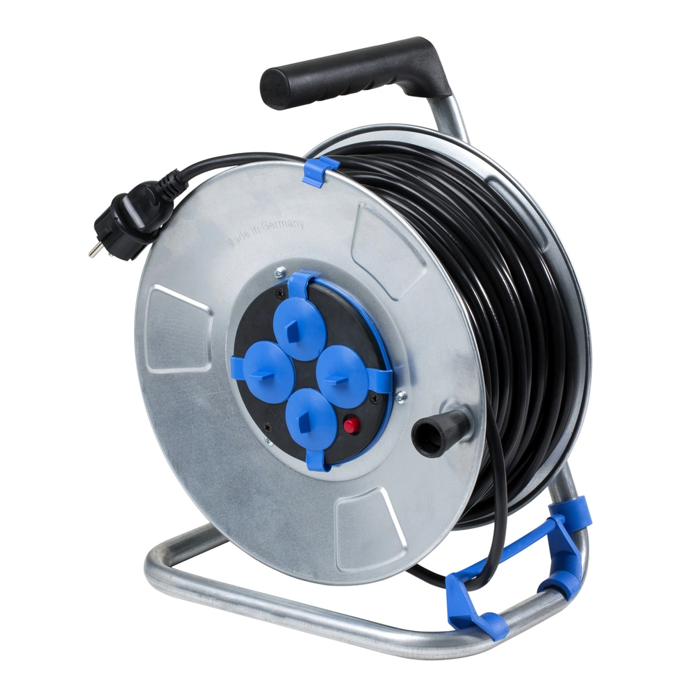 L'enrouleur de câble de sécurité pour une utilisation à l'intérieur avec poignée ergonomique et câble caoutchouc H05RRR-F 3 x 1,5 mm² est fabriqué en métal robuste. Cela le rend extrêmement solide. Le tambour est équipé d'un frein de stationnement et d'un guide-câble breveté pour un enroulement rapide et régulier du câble. Il est également équipé d'un interrupteur de protection thermique et de bouchons sur les prises.