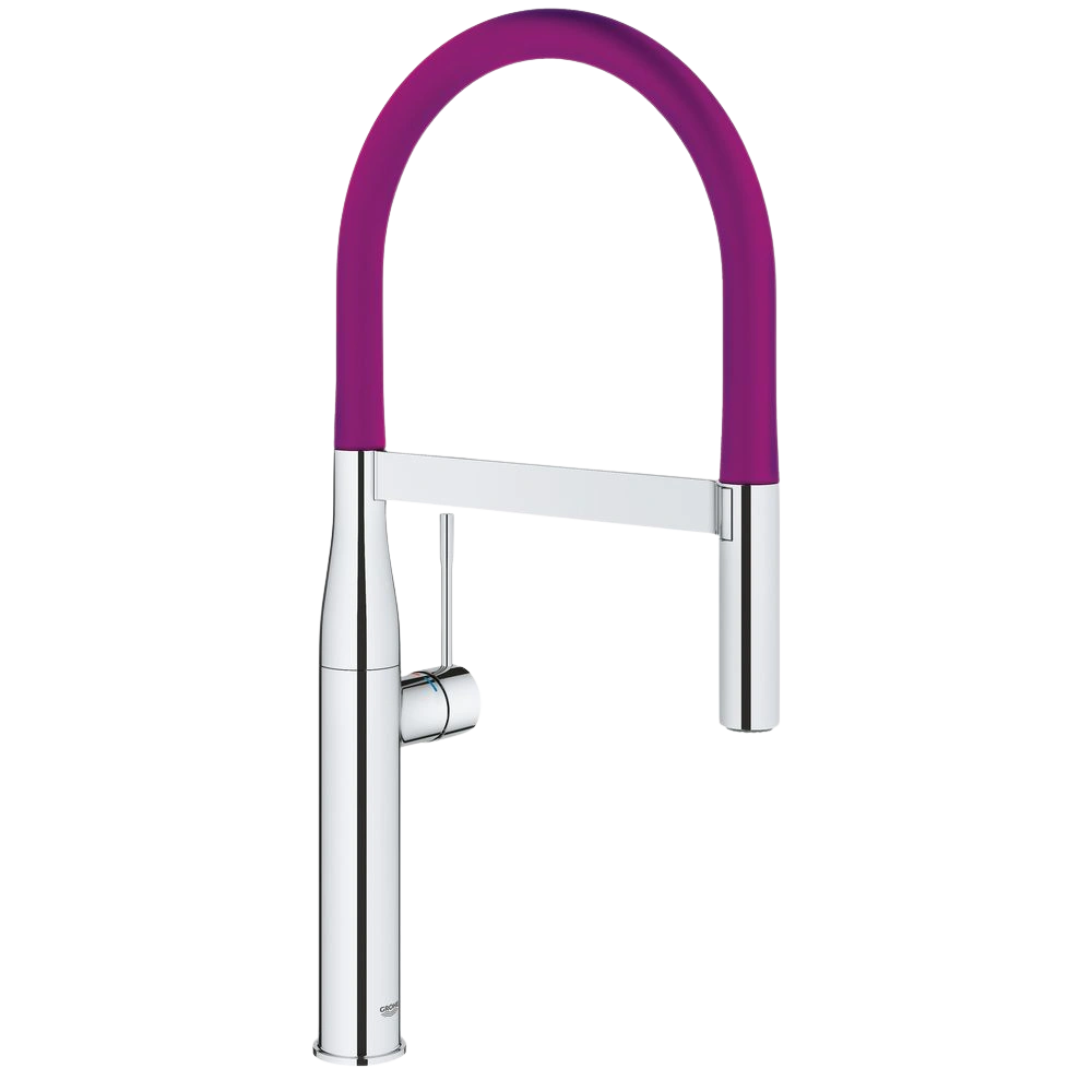 Robinetterie de cuisine design monocommandé pour montage monotrou. Le robinet à sécurité intrinsèque contre le reflux possède une cartouche céramique GROHE SilkMove® 28 mm avec limiteur de température et un bec orientable à 360° avec une douchette professionnelle en métal. Celle-ci peut être commutée du jet laminaire au jet de douche et dispose d'un flexible GrohFlexx® Santoprène flexible et hygiénique, de couleur contrastée. Grâce au système Grohe EasyDockM®, la douchette de rinçage glisse facilement et en douceur dans sa position initiale.