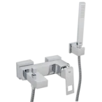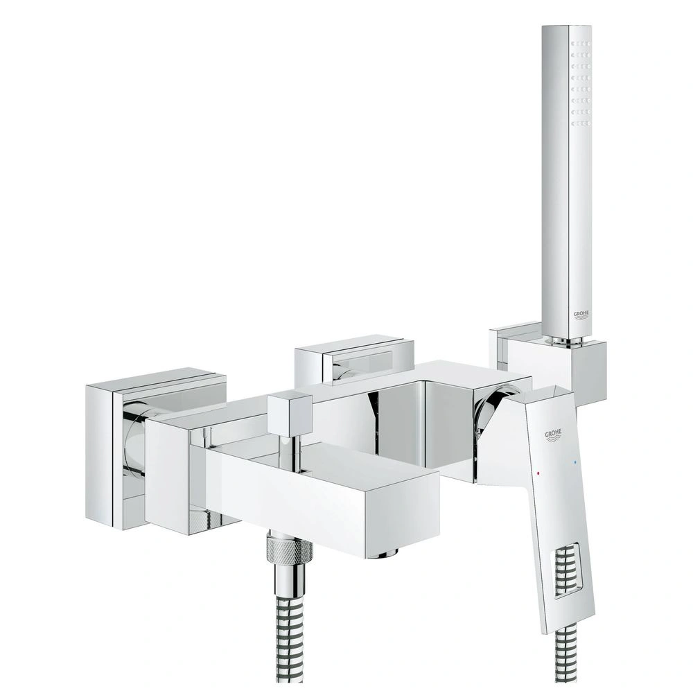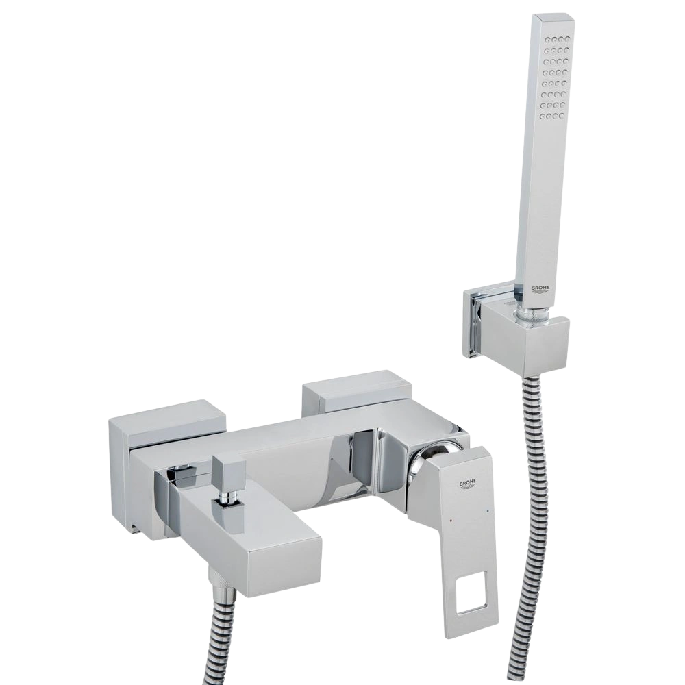 Robinetterie de baignoire monocommandé pour montage mural apparent, y compris garniture de douche avec douchette à main, support et flexible de douche.