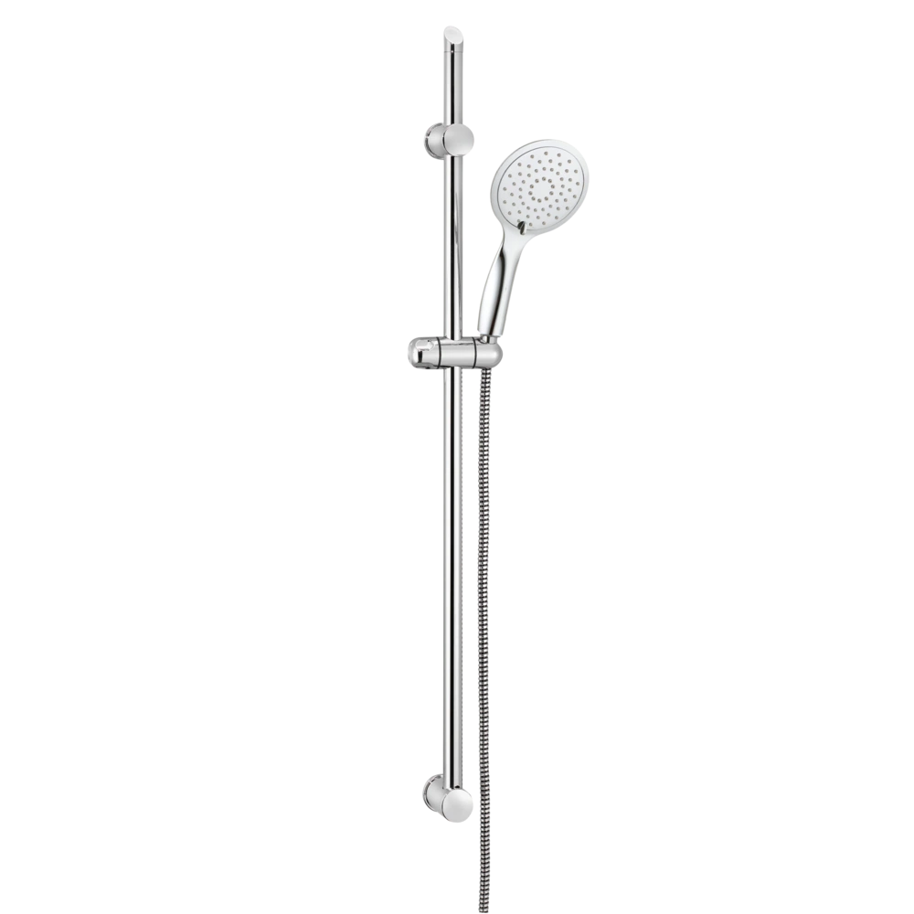 Toutes les informations sur le produit FournituresGarniture de douche chromée avec douchette à main, flexible de douche et barre de douche de 650 mm, y compris patin conique. La douchette à main offre cinq types de jets et des picots anticalcaires pour un nettoyage facile. La barre de douche est équipée d'un support mural variable pour utiliser les trous de perçage déjà existants.