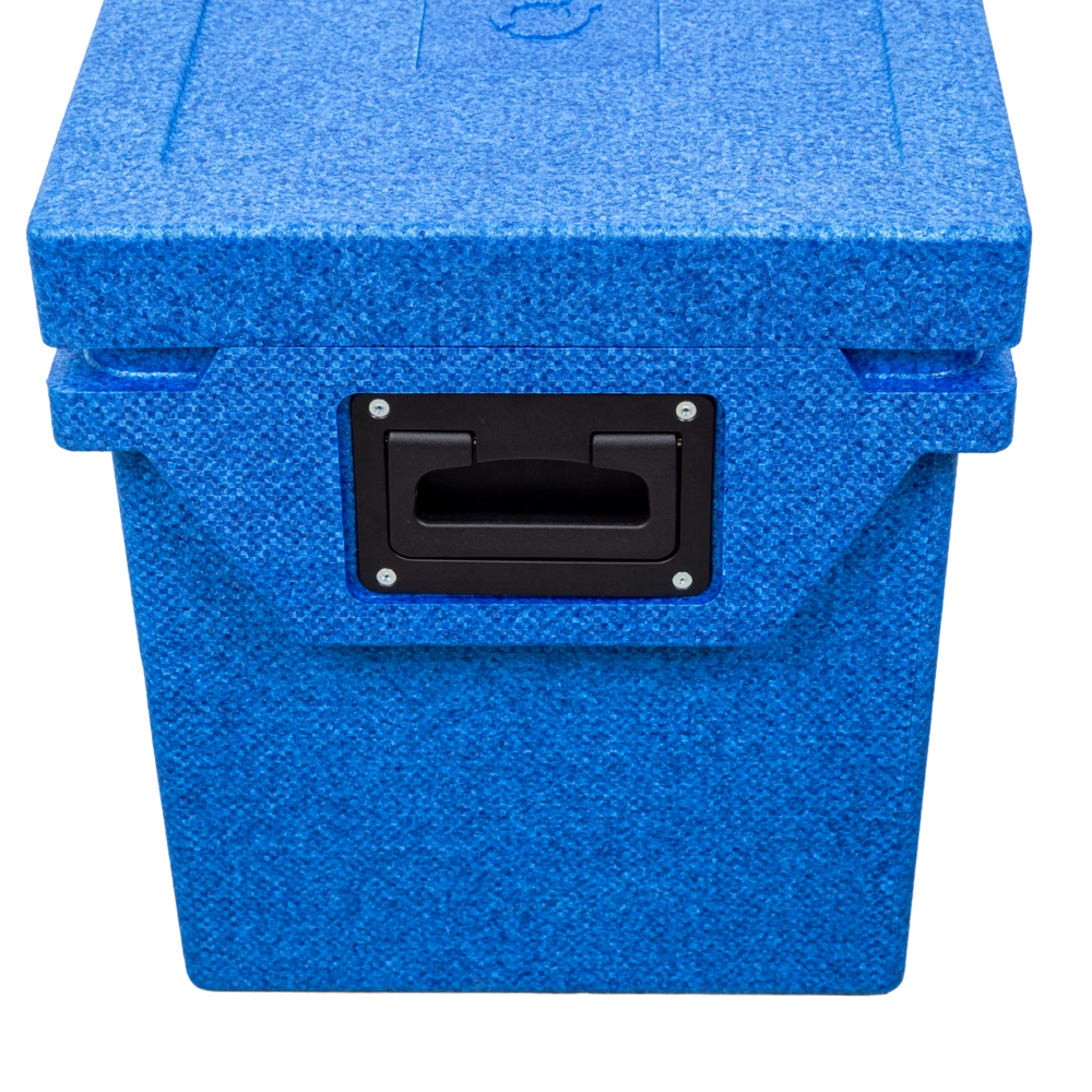 Glacière compacte avec isolation sous vide haute performance et accumulateurs de froid interchangeables. Elle fonctionne entièrement sans électricité, possède des poignées de transport pratiques et maintient la température souhaitée des boissons et des aliments pendant plusieurs jours grâce à la combinaison de l'isolation et du matériau à changement de phase. Avec une préparation adéquate, la glacière maintient la température jusqu'à 10 jours.