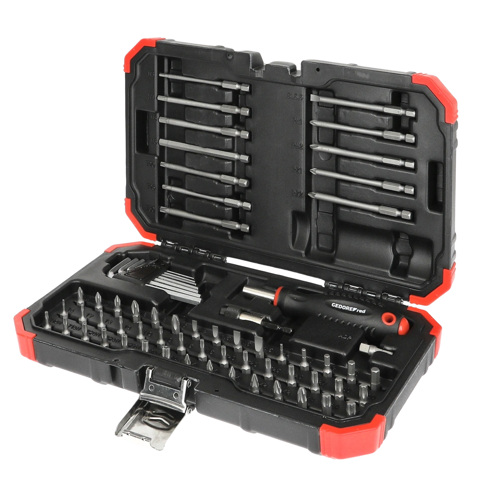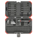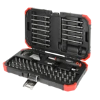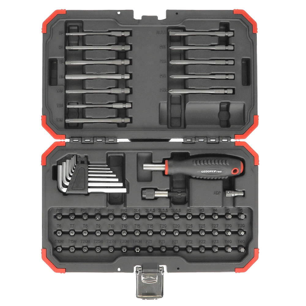 Jeu d'embouts avec tournevis pour un changement d'embouts simple et rapide livré dans un coffret en plastique robuste. Le kit comprend en outre un jeu de clés mâles coudées, un porte-embouts, un adaptateur 4 pans et 57 embouts différents à emmanchement hexagonal 1/4".