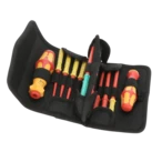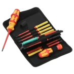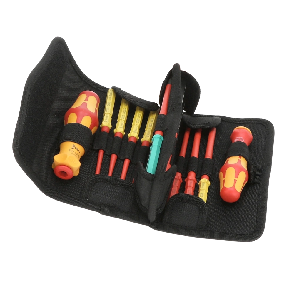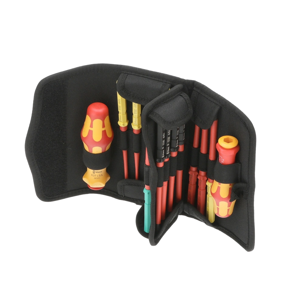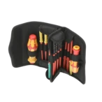 Jeu d'outils avec poignée à cliquet Kraftform, poignée Kraftform et lames interchangeables. Le cliquet intégré à fine denture permet de visser rapidement et en toute sécurité, même en tournant avec les doigts. Les lames VDE sont dotées d'une protection contre le roulement, d'un code couleur et d'un marquage de taille pour que le bon outil soit toujours à portée de main. Le set est rangé de manière compacte dans une pochette robuste avec surface Velcro Wera-2go.