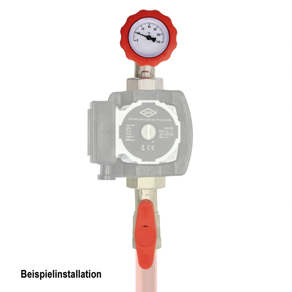 Kit de robinet à bille pour fermer un circulateur de tous les côtés. Ce kit permet un remplacement rapide et facile de la pompe. Le thermomètre est intégré dans le robinet à bille supérieur.