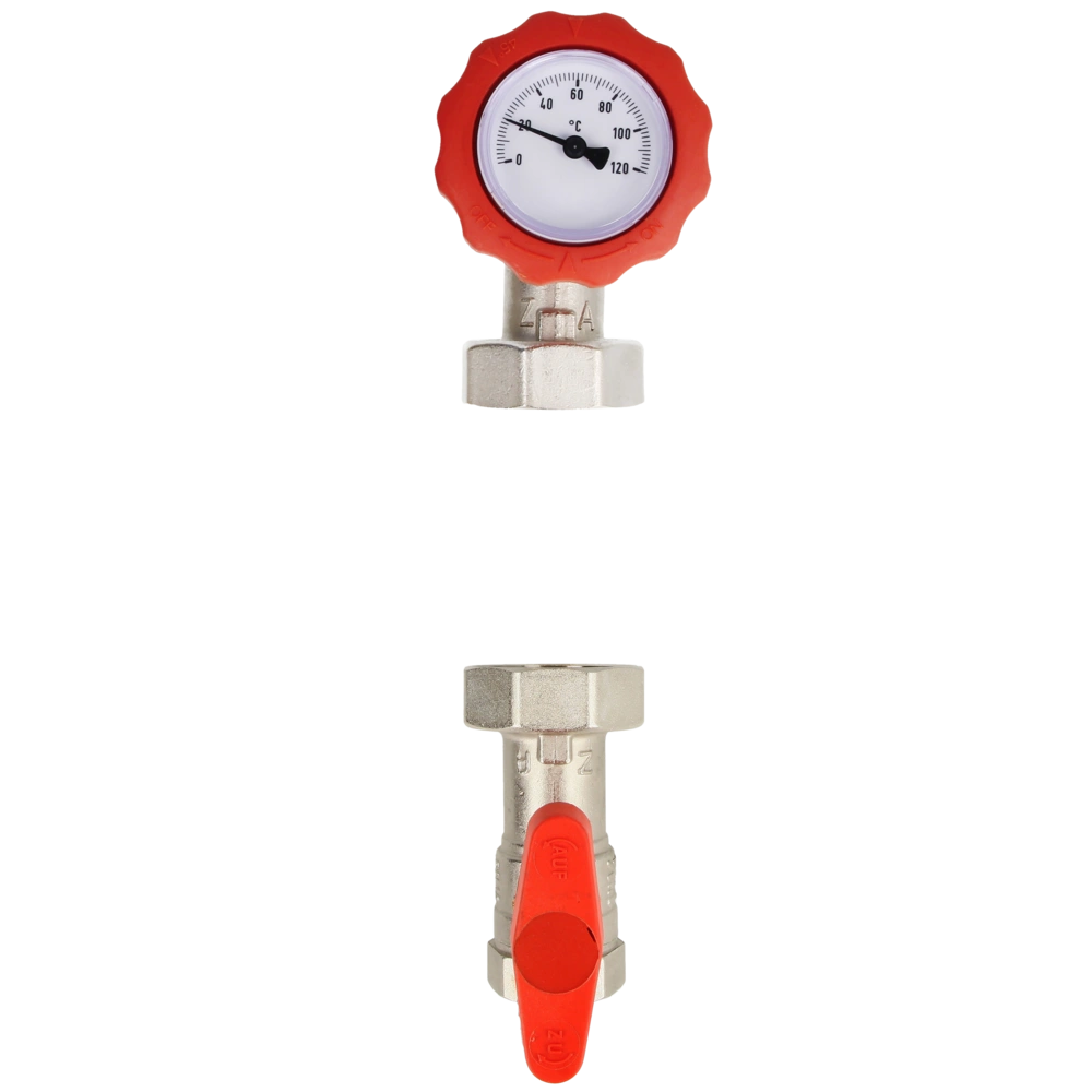 Kit de robinet à bille pour fermer un circulateur de tous les côtés. Ce kit permet un remplacement rapide et facile de la pompe. Le thermomètre est intégré dans le robinet à bille supérieur.