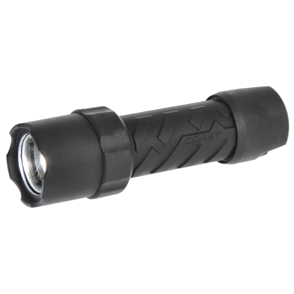 Lampe de poche étanche à piles avec boîtier en acier inoxydable recouvert de plastique et protection anti-roulement. La lampe peut être réglée en continu d'un faisceau large à un faisceau...