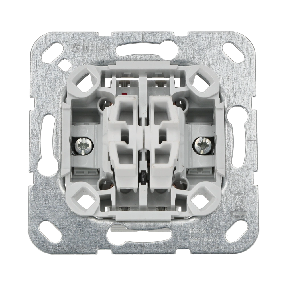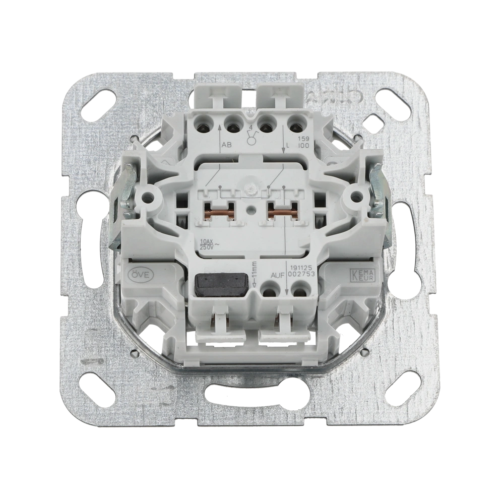 Mécanisme interrupteur de stores à bascule avec blocage contre l'enclenchement des deux côtés. Verrouillage électrique et mécanique. Convient comme poste secondaire pour l'utilisation de commandes de stores avec entrée de poste secondaire.