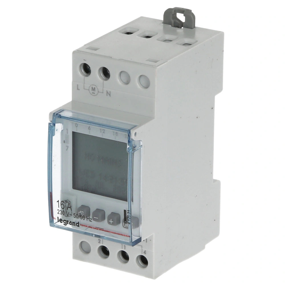 Horloge programmable numérique pour la programmation annuelle et hebdomadaire à monter sur un profilé chapeau.