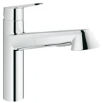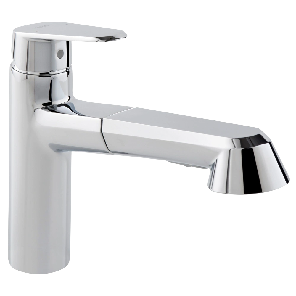 Mitigeur monocommande d'évier avec douchette extractible Dual pour montage monotrou. Le mitigeur est équipé d'un bec plat, d'une cartouche céramique GROHE SilkMove® 35 mm, d'une finition chromée GROHE StarLight®, d'un limiteur de débit à réglage variable et d'un bec en fonte orientable à 100°. Le mitigeur est doté d'une sécurité intrinsèque contre les retours d'eau.