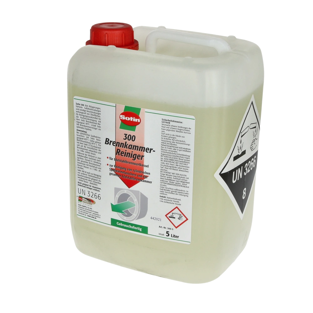 Nettoyant pour les chambres de combustion fonctionnant au fioul, les appareils à condensation, les échangeurs thermiques et les thermes en acier inoxydable. Cette solution fortement alcaline, prête à l'emploi, à vaporiser ou à utiliser en immersion, élimine les salissures les plus dures comme la suie, les dépôts de sulfate et autres dépôts ininflammables. Utilisable comme nettoyant de base et pour l'entretien annuel.