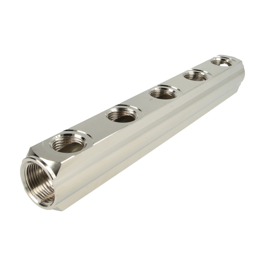 Collecteur en laiton pour le raccordement de tubes en cuivre, PEX, polybutylène et tubes métalliques composites.