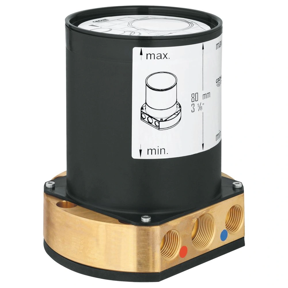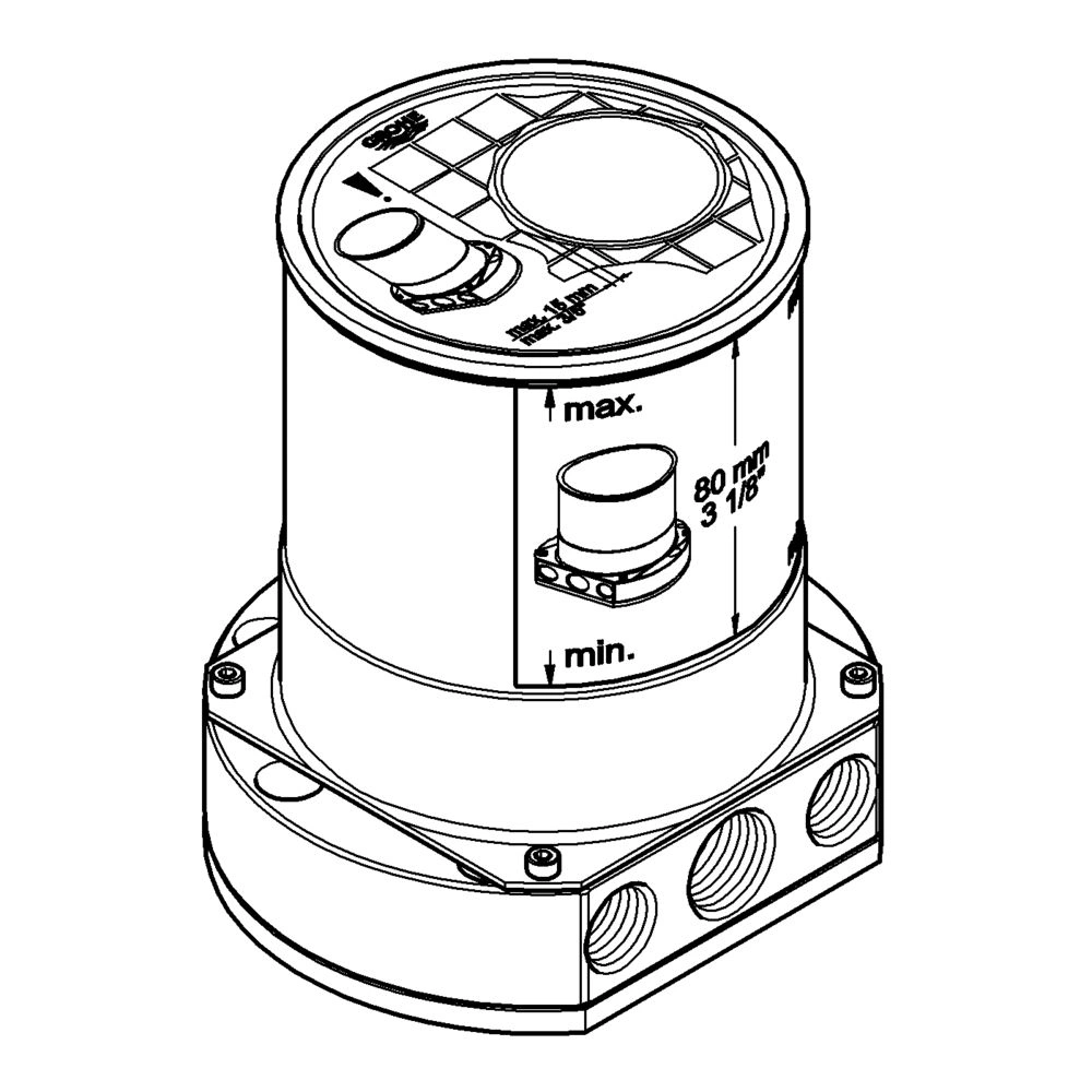 La platine support de GROHE pour bec et mitigeur de bain en pose libre est livrée avec un socle réglable horizontalement et radialement, une profondeur d'encastrement de 0 à 80 mm, un raccord eau mélangée 1/2'', un bouchon de rinçage et un kit de fixation.