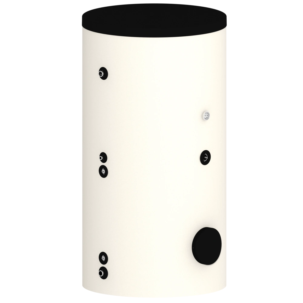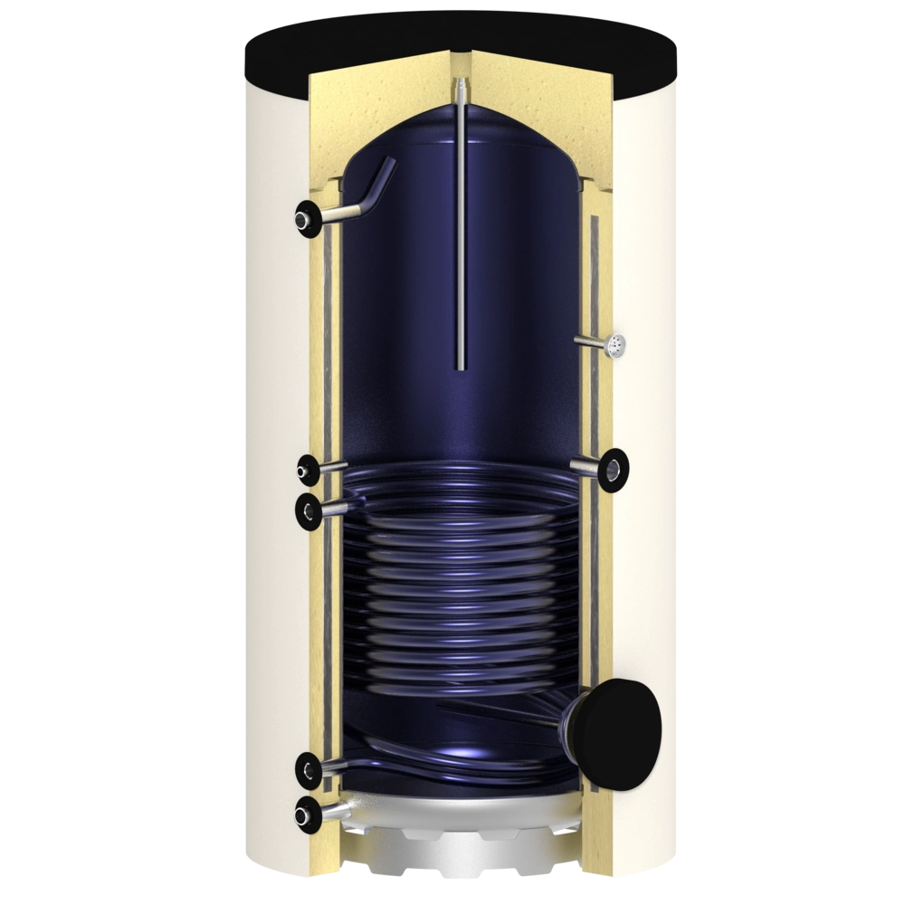 Ballon d'eau fraîche : il s'agit en fait d'un ballon tampon avec un tube ondulé en acier inoxydable intégré, qui sépare l'eau potable de l'eau de chauffage et sert également d'échangeur thermique.
