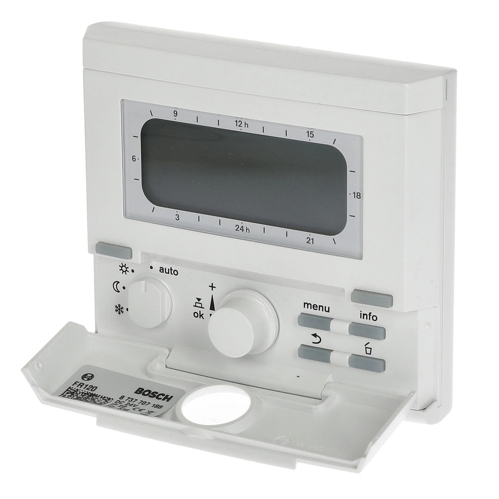 Toutes les informations sur le produitRégulateur de température ambiante numérique pour tous les appareils de chauffage avec interface Heatronic 3 compatible BUS ou analogique 1-2-4. La prédéfinition de la température du circuit de chauffage assure une adaptation continue de la puissance du brûleur à la puissance thermique nécessaire. L'installation de chauffage peut ainsi être adaptée individuellement aux besoins quotidiens en température. De plus, en combinaison avec un module de commutation solaire ISM1, la production d'eau chaude solaire peut être optimisée. Le FR120 propose un programme hebdomadaire, un programme d'eau chaude avec différents niveaux de température réglables dans le programme horaire, un programme horaire pour la commande d'une pompe de circulation, une fonction vacances et une fonction de désinfection thermique. En outre, il est possible d'adapter d'autres réglages des programmes de chauffage et d'eau chaude ainsi que des possibilités d'affichage. Pour une compréhension rapide, les codes d'erreur et de service sont affichés en texte clair. Grâce à la préprogrammation en usine, le régulateur est immédiatement prêt à fonctionner. L'écran en texte clair guidé par des menus rend l'utilisation particulièrement simple.