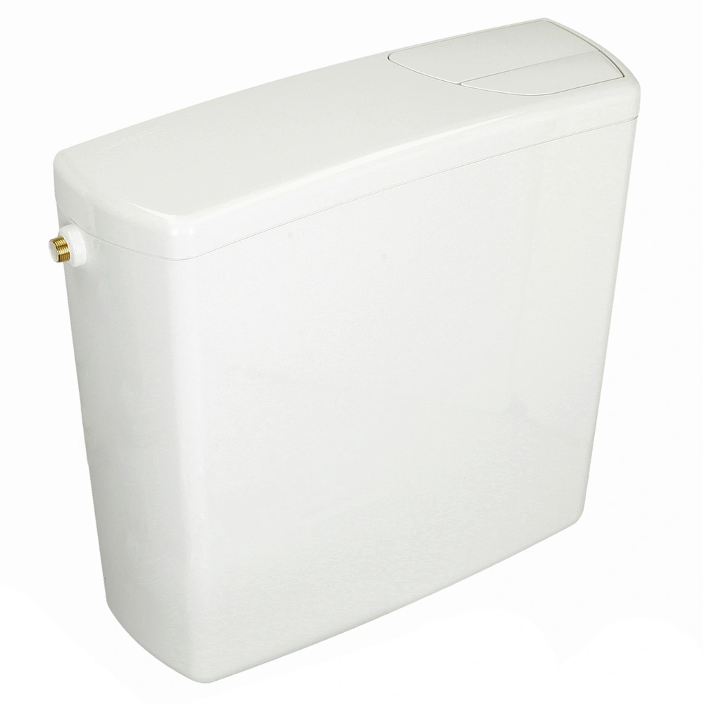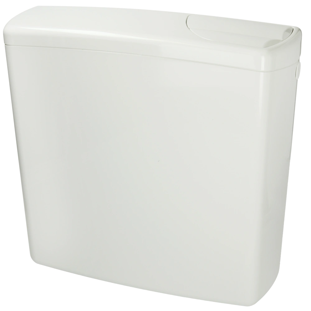 Le réservoir de chasse d'eau WC pour montage apparent est équipé d'une touche avec deux volumes de rinçage, intégré dans le couvercle. Le raccordement à l'eau se fait au choix à gauche, à droite ou à l'arrière au milieu...