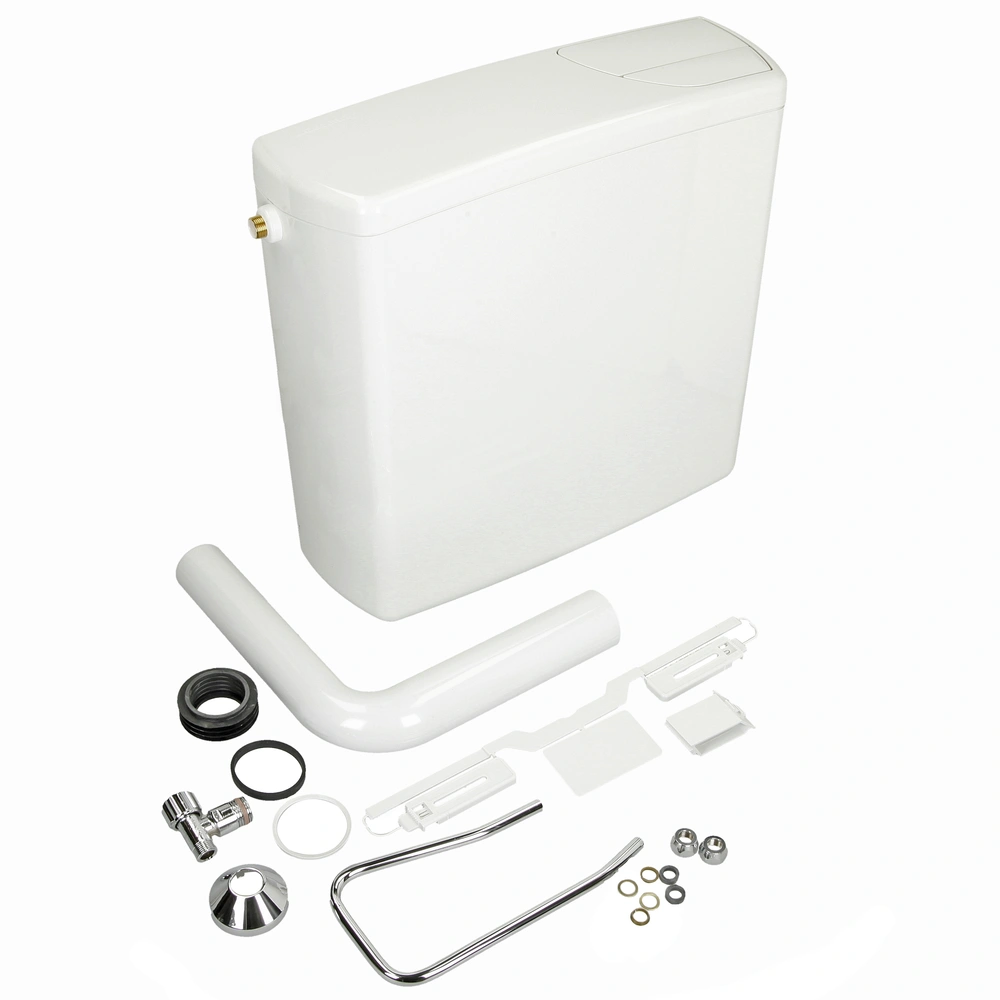 Toutes les informations sur le produit FournituresLe réservoir de chasse d'eau WC pour montage apparent est équipé d'une touche avec deux volumes de rinçage, intégré dans le couvercle. Le raccordement à l'eau se fait au choix à gauche, à droite ou à l'arrière au milieu. De plus, le réservoir de chasse a une isolation étanche à la vapeur d'eau et au bruit.