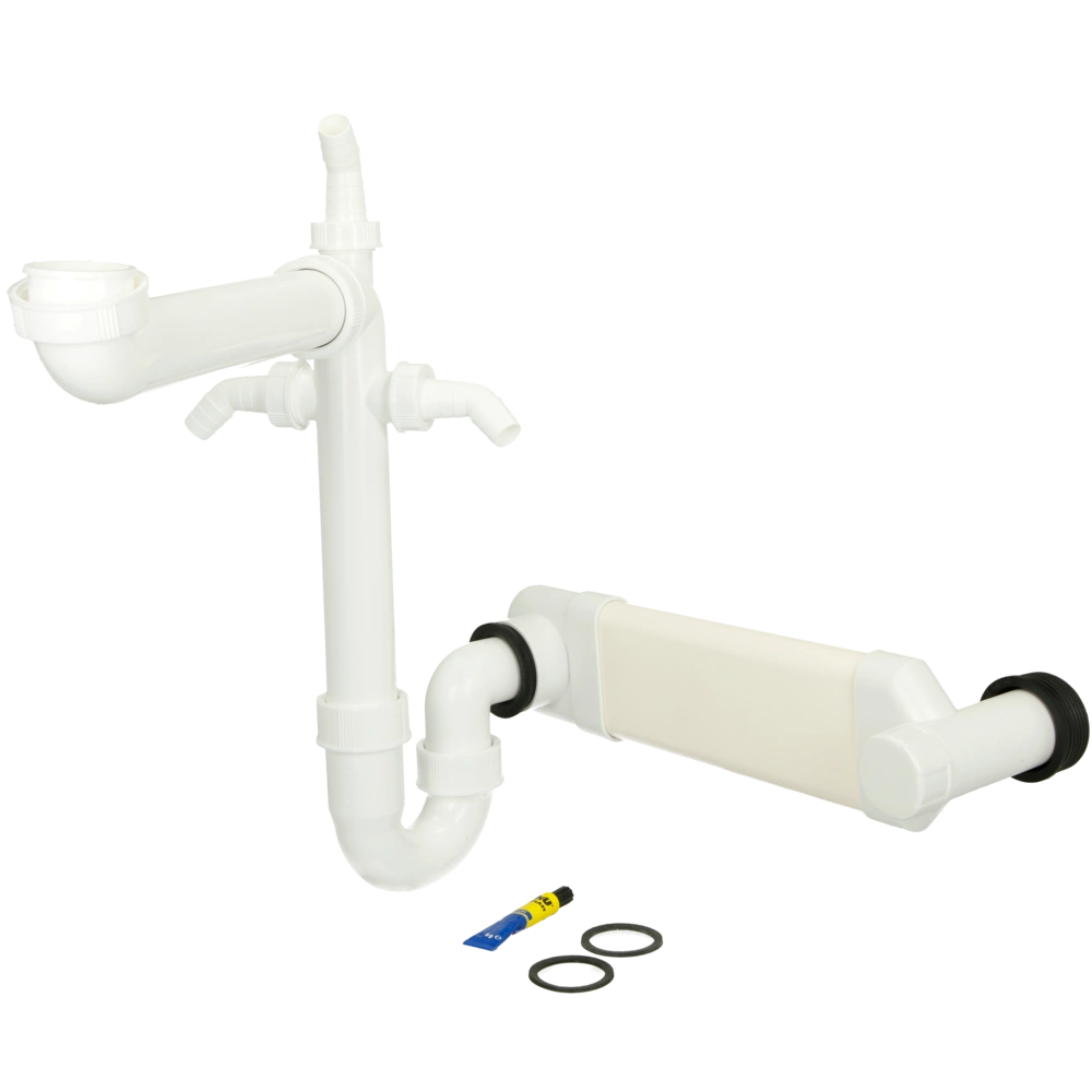 Siphon à encombrement réduit en plastique avec 3 raccords pour appareils et sortie horizontale en tube plat pouvant être raccourcie.