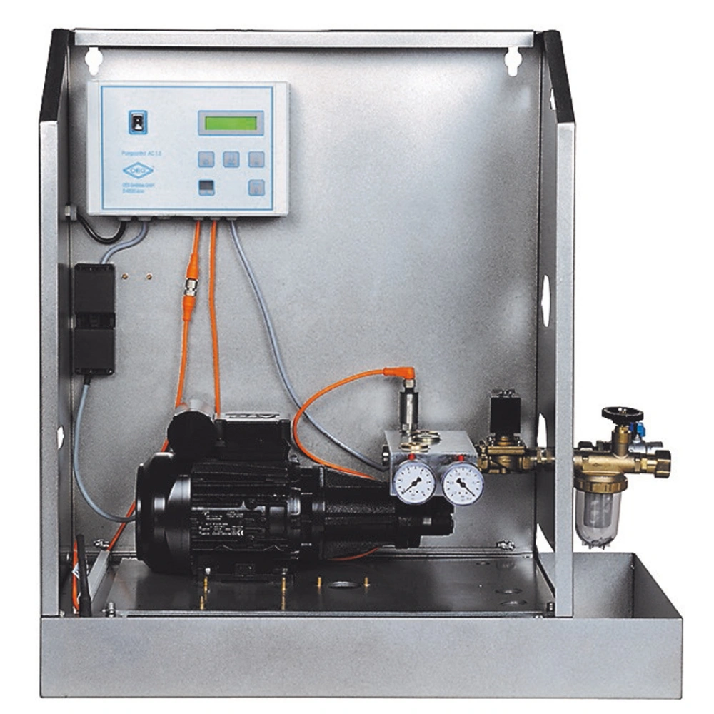 La surveillance du courant du moteur a lieu grâce au bloc de commande digital des pompes avec affichage du menu LCD. De plus Il y a une surveillance de la commutation des pompe, d'une sécurité de rupture de canalisation et un indicateur de fuite intégré. La commande est équipée d'une sortie de signalisation d'erreur et de signalisation d'état opérationnel sans potentiel.