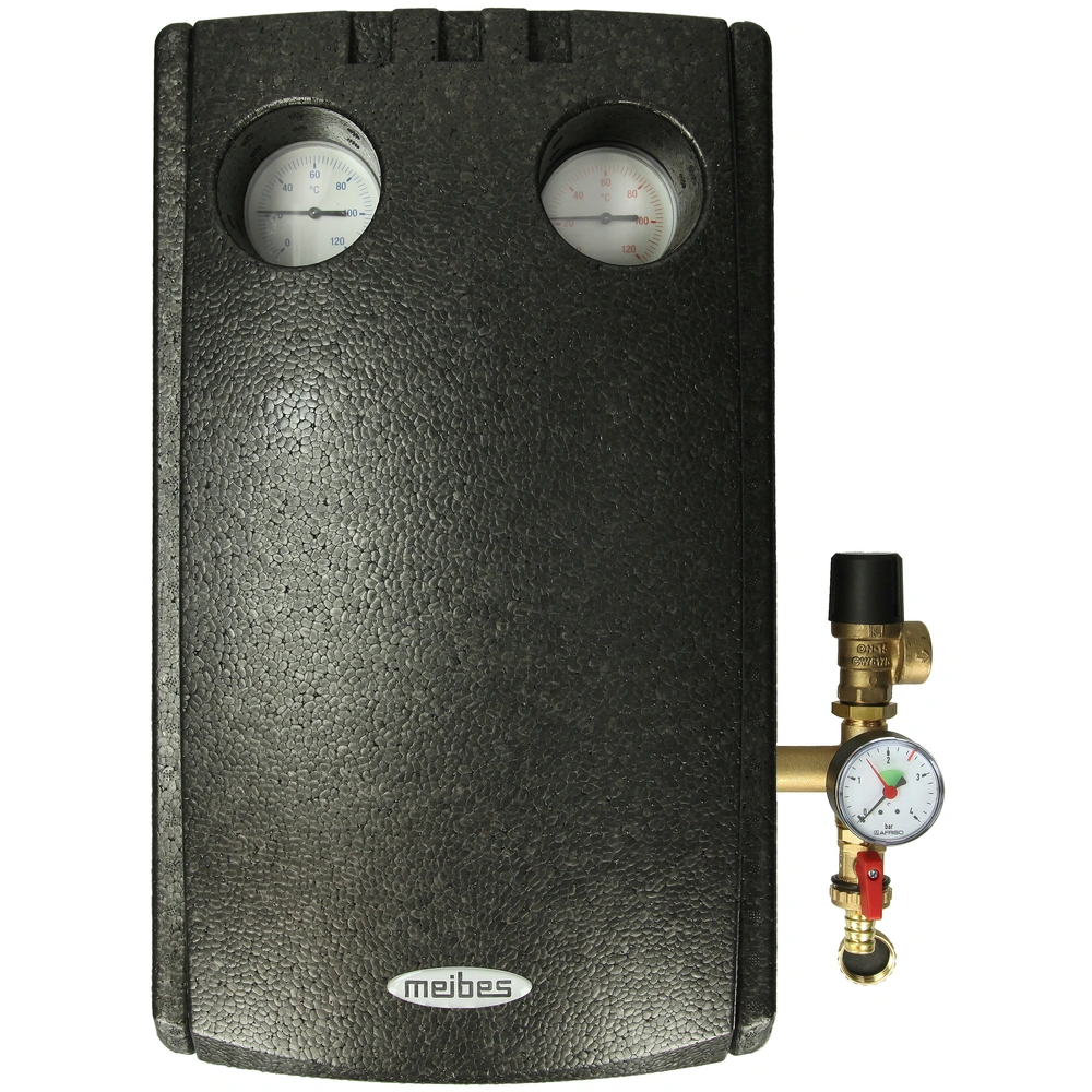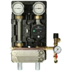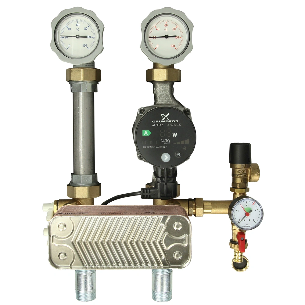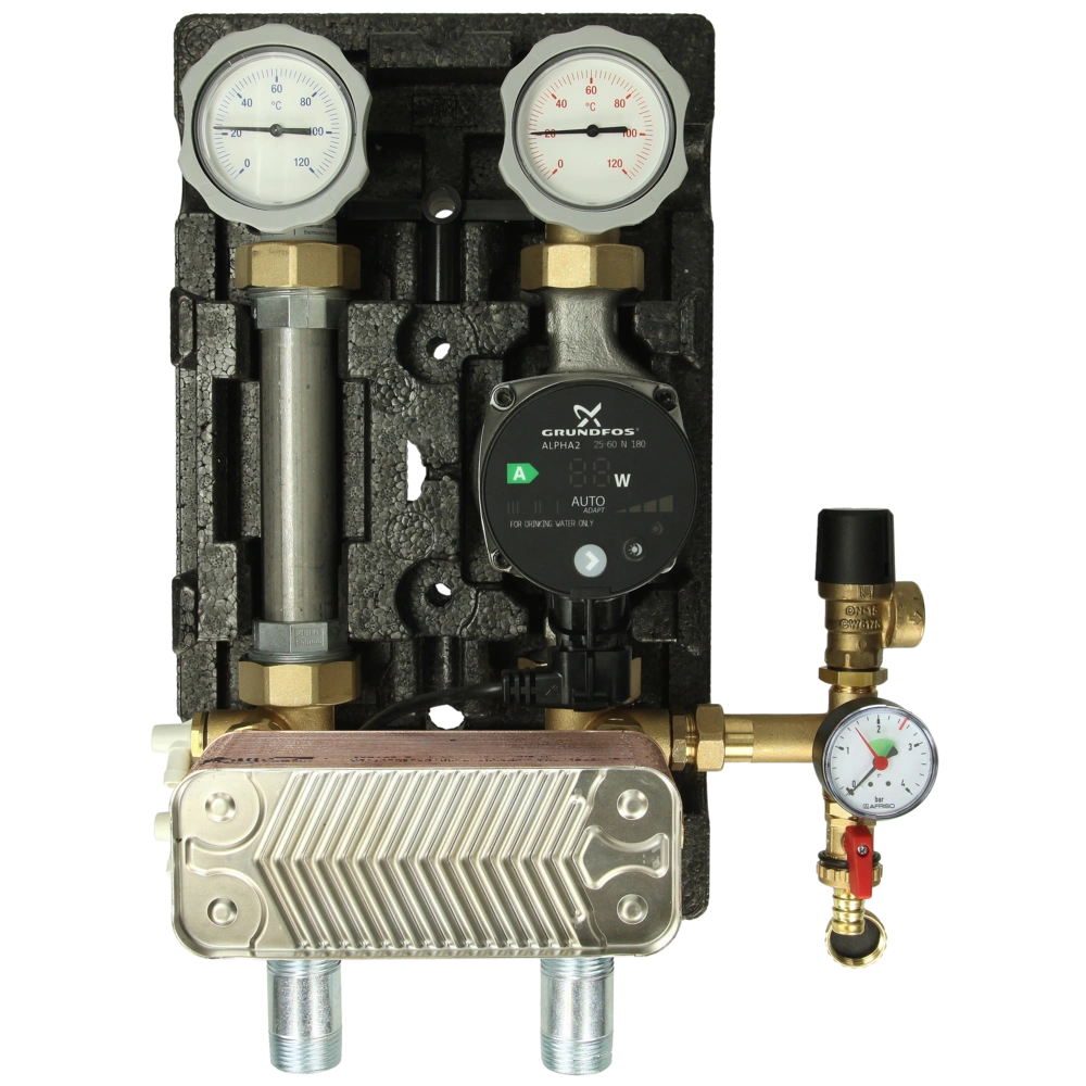 Complet avec pompe de circulation (EL 180 mm en bronze), avec câble de raccordement de 2 m, deux robinets à bille à 3 voies (dont un avec frein à commande manuelle par gravité), deux thermomètres à contact, échangeur de chaleur compact à 20 plaques, groupe de sécurité avec soupape de sécurité 3 bar et manomètre 0-4 bar,