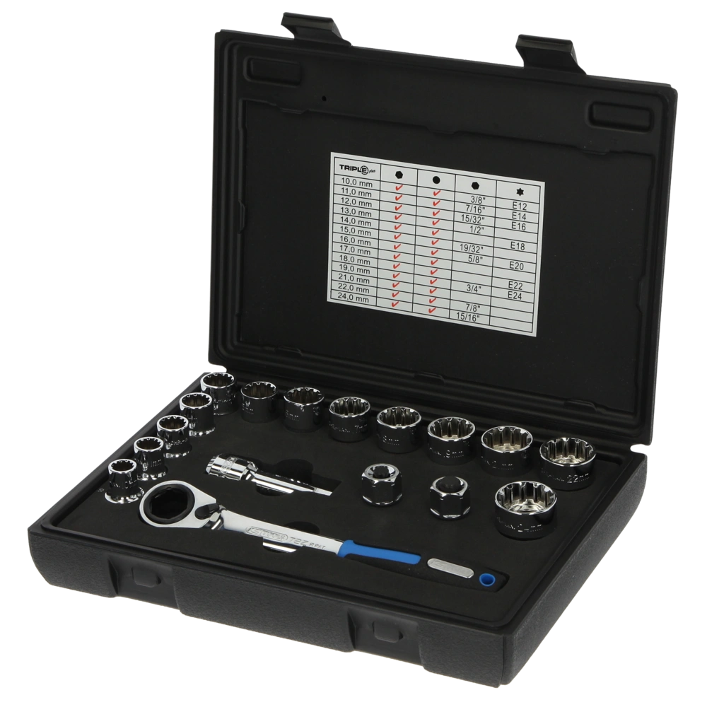 Toutes les informations sur le produit FournituresLe jeu de douilles traversantes chromé brillant est livré dans un coffret robuste en PE rigide. Grâce à l'insert préformé et à l'inscription dans le couvercle, chaque douille peut être trouvée d'une seule main.