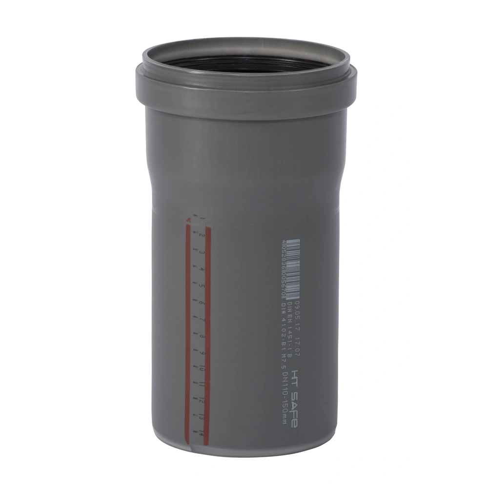 Tuyau HTsafe en PP-H difficilement inflammable selon la norme DIN 4102 (B1) avec un embout enfichable d'un côté et une triple lèvre d'étanchéité. Adapté à la canalisation des eaux usées à l'intérieur des bâtiments selon la norme DIN EN 1451. Le tuyau convient aux eaux usées chaudes, froides et agressives ainsi qu'aux systèmes d'aspiration centralisés.