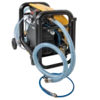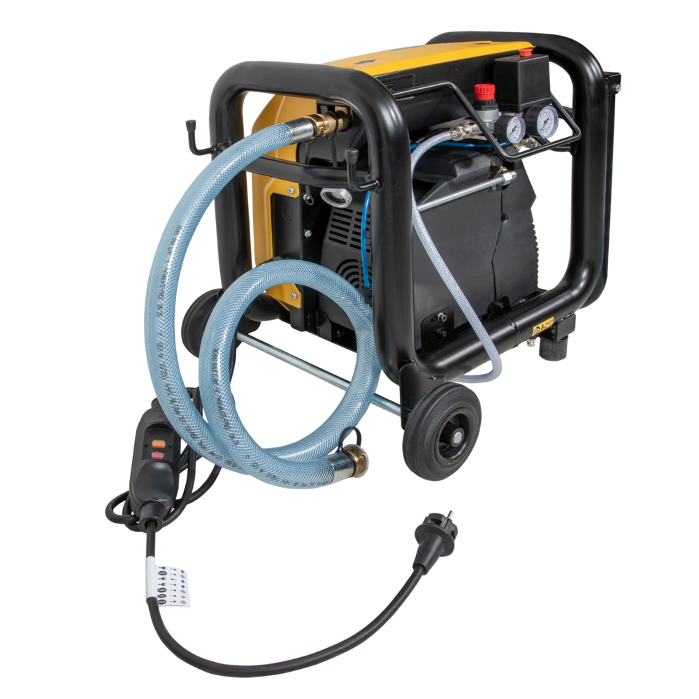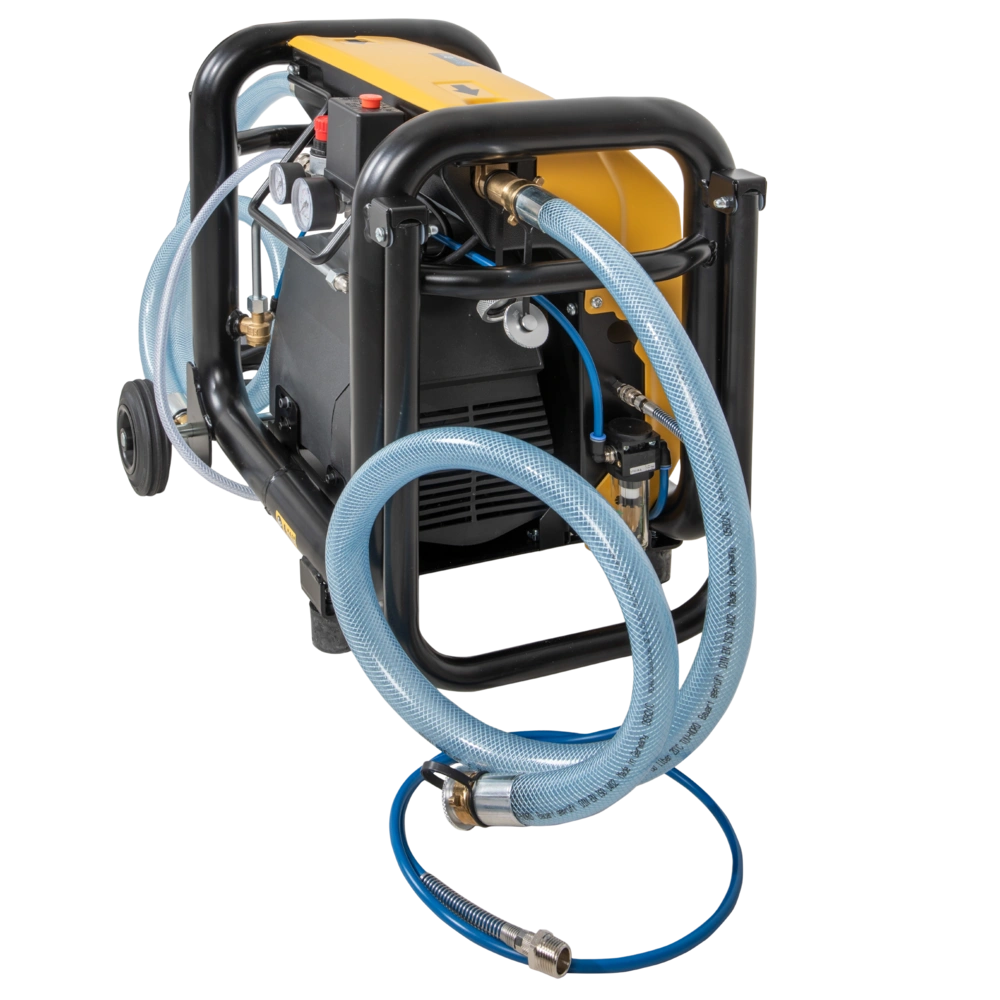 Puissante unité de rinçage et de test de pression avec compresseur alternatif sans huile. L'appareil peut être utilisé de diverses manières pour le rinçage à l'eau ou avec un mélange...