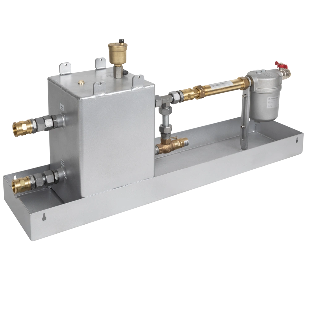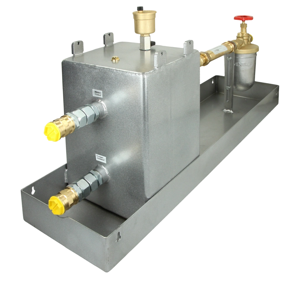 Le vase de pression dynamique pour le fonctionnement en aspiration est comparable à un filtre monotube surdimensionné avec alimentation. Il convient aux grands débits et possède une pièce de raccord pour le compteur de fioul. La purge se fait manuellement au moyen d'un robinet à bille et d'un purgeur rapide automatique. Le vase de pression dynamique convient pour une puissance de brûleur allant jusqu'à 4 000 kW au débit de retour maximum de la pompe. L'installation est possible du côté droit ou gauche.