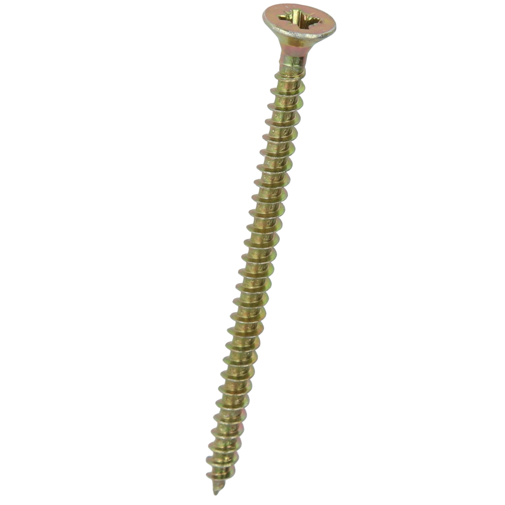 Vis à tête fraisée à filetage complet, galvanisée et chromatée jaune, pour une utilisation universelle dans le bois dur, les panneaux de particules et le plastique.