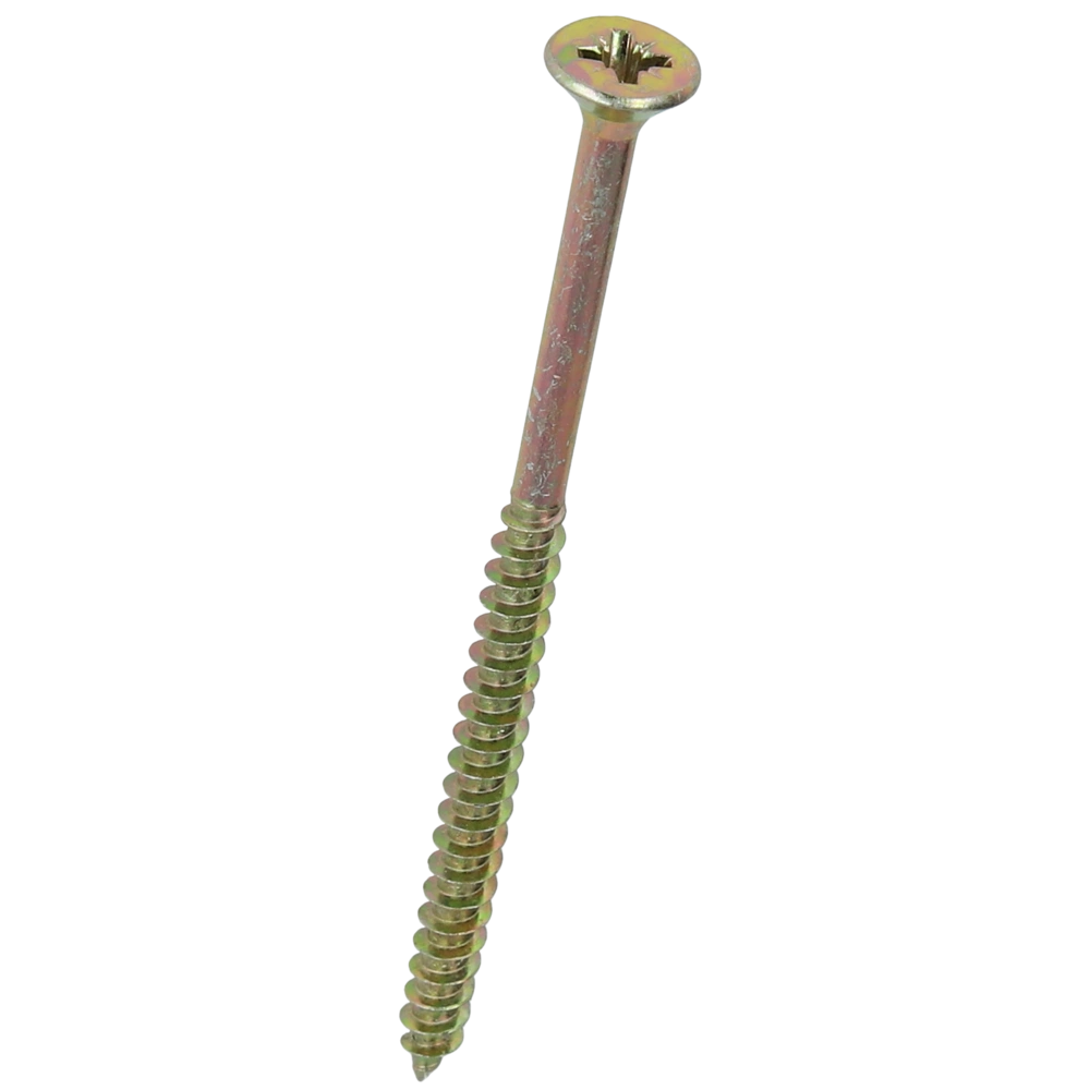 Vis à tête fraisée galvanisée avec chromatage jaune et filetage partiel pour une utilisation universelle dans le bois dur, les panneaux de particules et le plastique.