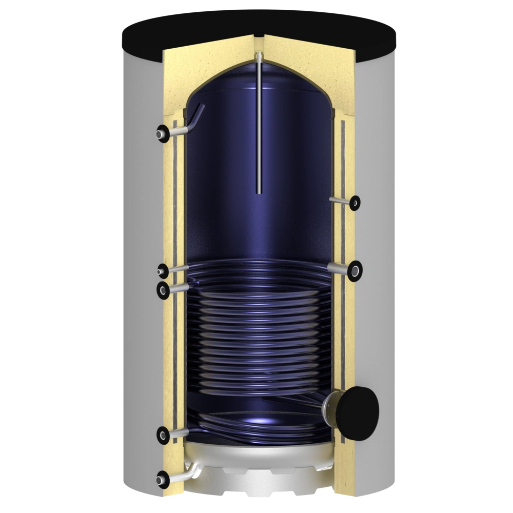 La superficie interna del bollitore ha una finitura smaltata di alta qualità. La superficie dello scambiatore di calore di dimensioni generose, che si estende fino al pavimento, garantisce un ottimo scambio di calore. Una flangia d'ispezione laterale consente una facile manutenzione e pulizia del bollitore e, se necessario, può essere equipaggiato con un manicotto per la resistenza. L'impareggiabile isolamento sottovuoto OEG dei cilindri ha perdite di calore significativamente inferiori rispetto al guscio di coibentazione dei cilindri standard presenti sul mercato.