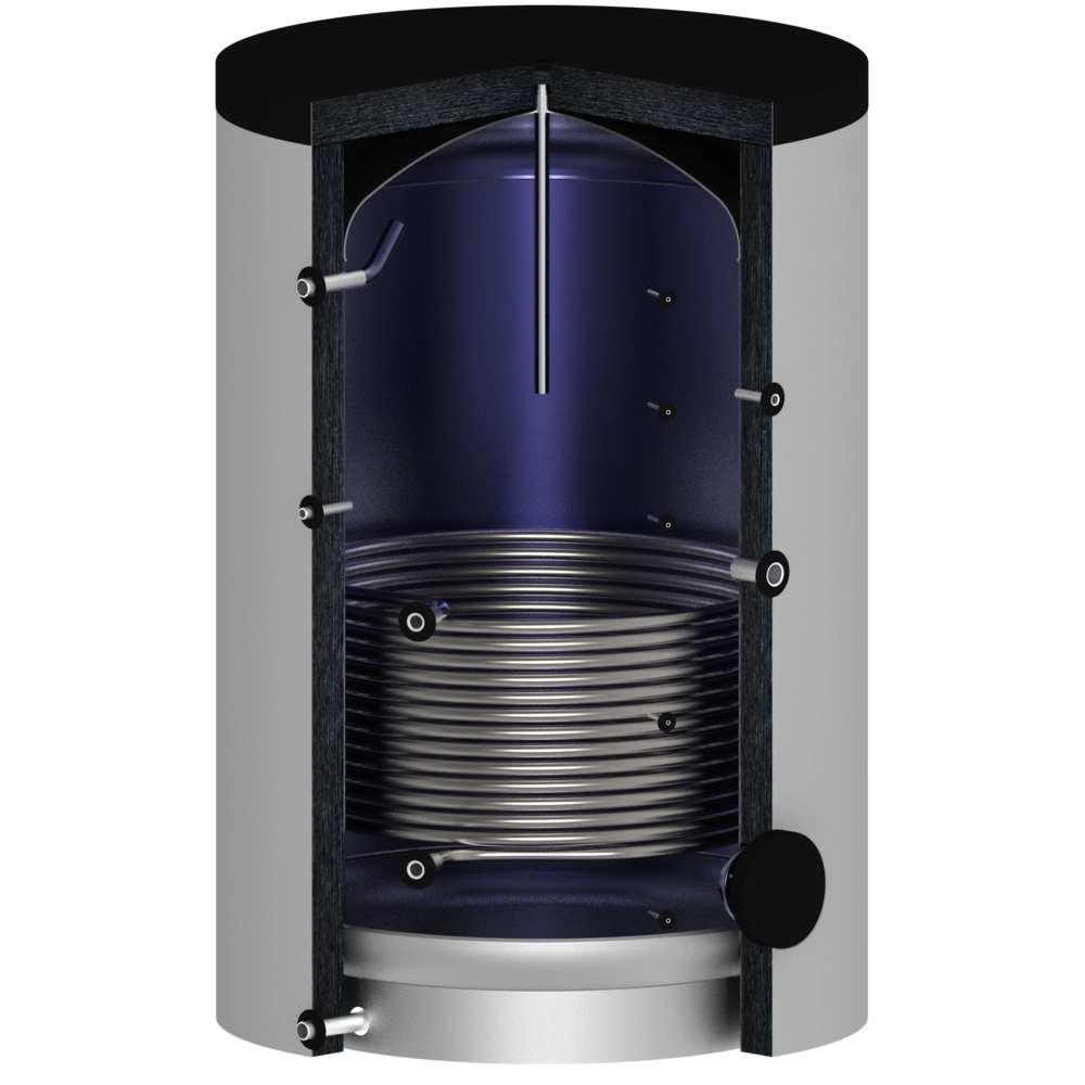 La superficie interna del bollitore ha una finitura smaltata di alta qualità. La superficie dello scambiatore di calore di dimensioni generose, che si estende fino al pavimento, garantisce un ottimo scambio di calore. Una flangia d'ispezione laterale consente una facile manutenzione e pulizia del bollitore e, se necessario, può essere equipaggiato con un manicotto per la resistenza. L'impareggiabile isolamento sottovuoto OEG dei cilindri ha perdite di calore significativamente inferiori rispetto al guscio di coibentazione dei cilindri standard presenti sul mercato.